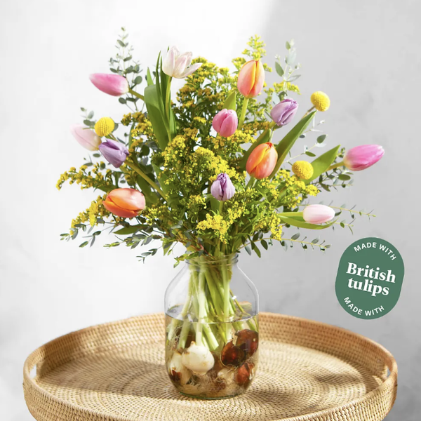 24 stems including tulips, solidago, craspedia and eucalyptus. These tulips are British-grown and are sent with bulbs attached, which can be replanted and enjoyed next spring.
