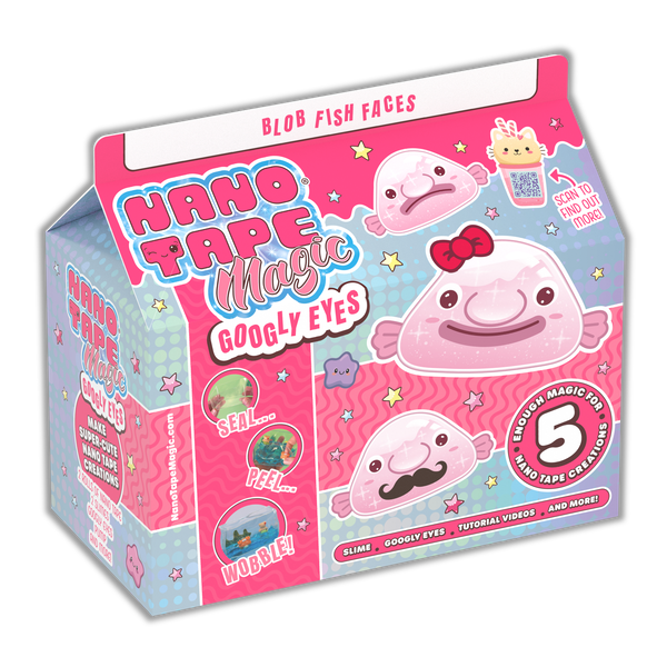 Nano Tape Magic ‘Googly Eyes’ lets you personalise your creations with fun, moveable eyes. These googly eyes transform nano tape designs into laugh-out-loud characters. Stick them on and watch them come alive! The Blob Fish Faces kit comes with enough Magic for five hilarious blob fish Nano Tape Creations.