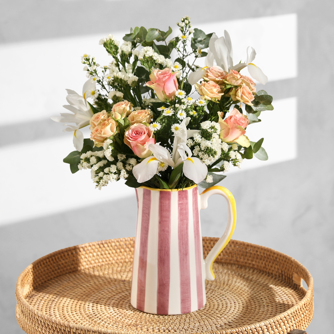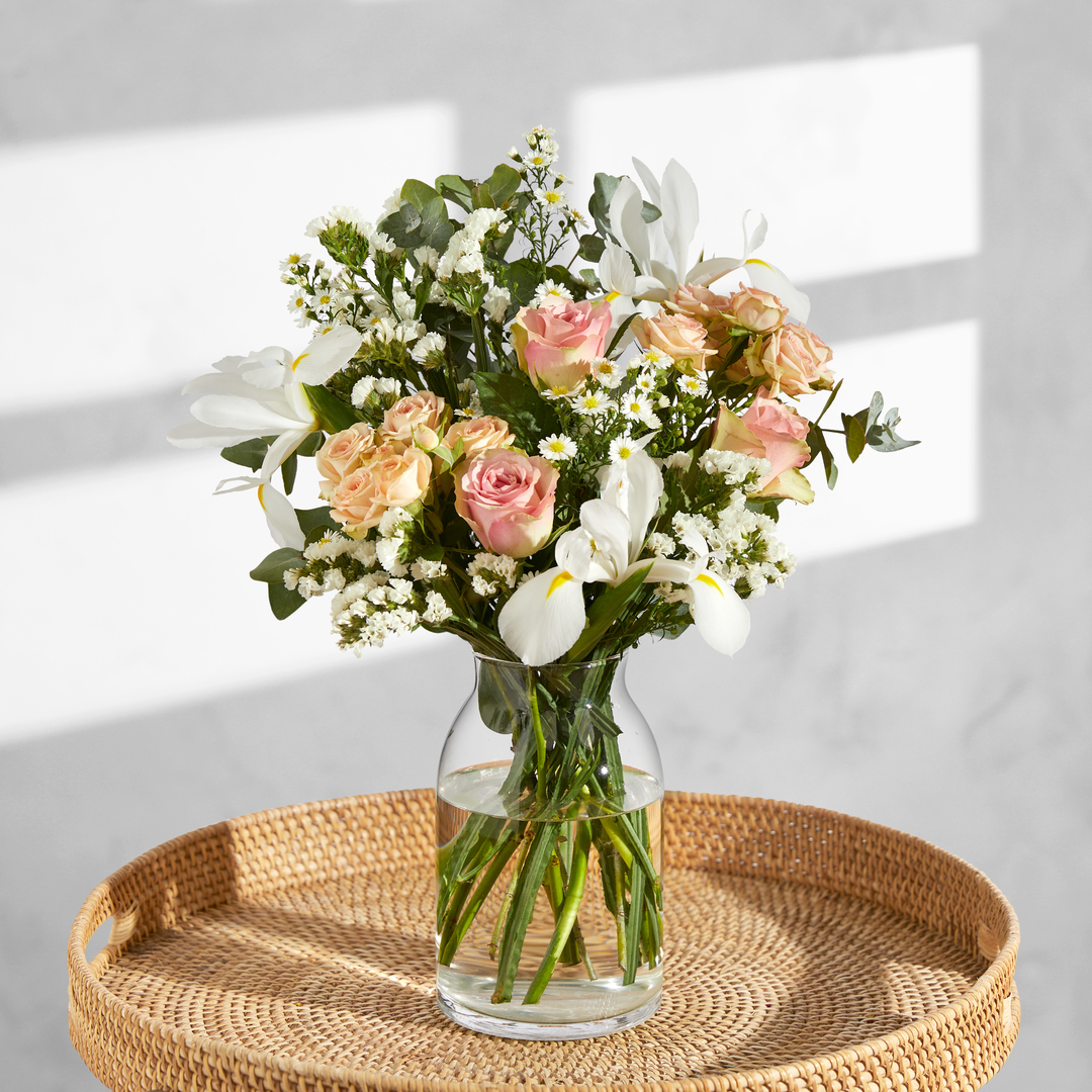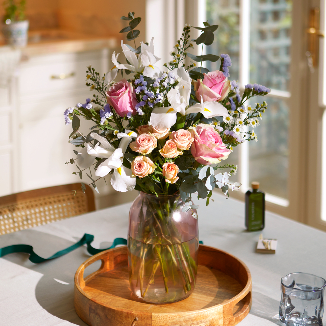 We love a day-brightening bloom. Blush-worthy roses. A twinkle of star-shaped asters. And a sprinkling of hopeful irises. This fragrant bunch fills the air with kindness. 17 stems, including rosa, limonium, iris and aster.