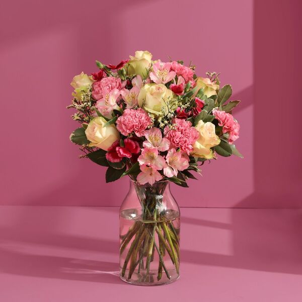 22 stems including roses, alstroemeria, carnations, sweet williams, pitto, greenbell and limonium. Arrives all dressed up in a limited edition Liberty print flower wrap