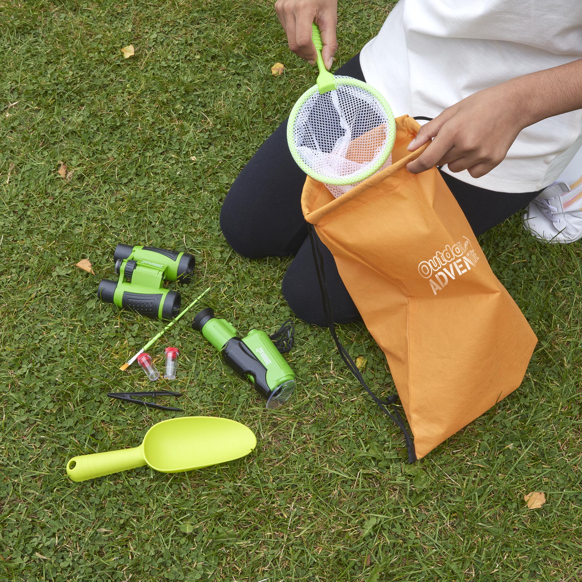 The Outdoor Adventure Mega Explorer Kit is brand new for 2026 and is perfect for explorations, field trips, and outdoor studies. Mini adventurers will love this 9-piece kit includes everything you need as well as a handyl storage bag. See the world in close up through the microscope, grab the binoculars to spot wildlife, and use the hand tools to see what you can discover!