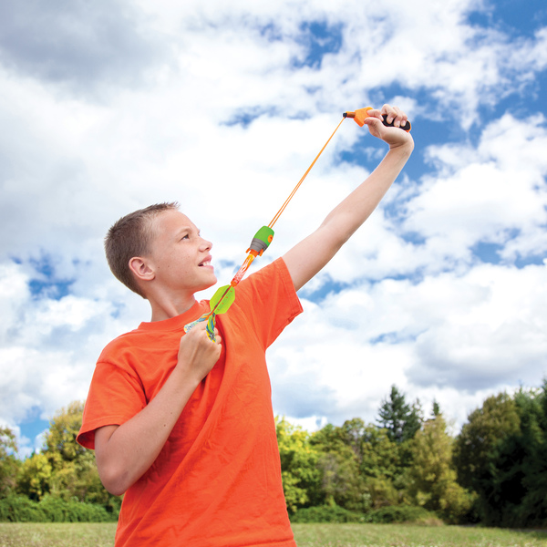 The Blast Off Sky Ripperz Combo Pack is a high-performance toy that launches rockets with pull back bungee technology. The Sky Ripperz rocket can launch over 78ft/24m, no fuel or batteries are needed to fly sky high, whilst the Heli Howler launches up to 46ft/14m with an awesome spinning action as it descends back to the ground. With your launch arm up, just loop the bungee around the launch hook of the rocket, pull the tab downward, and release, sending the Sky Ripperz/Heli Howler screaming in the air, thanks to the embedded whistle!