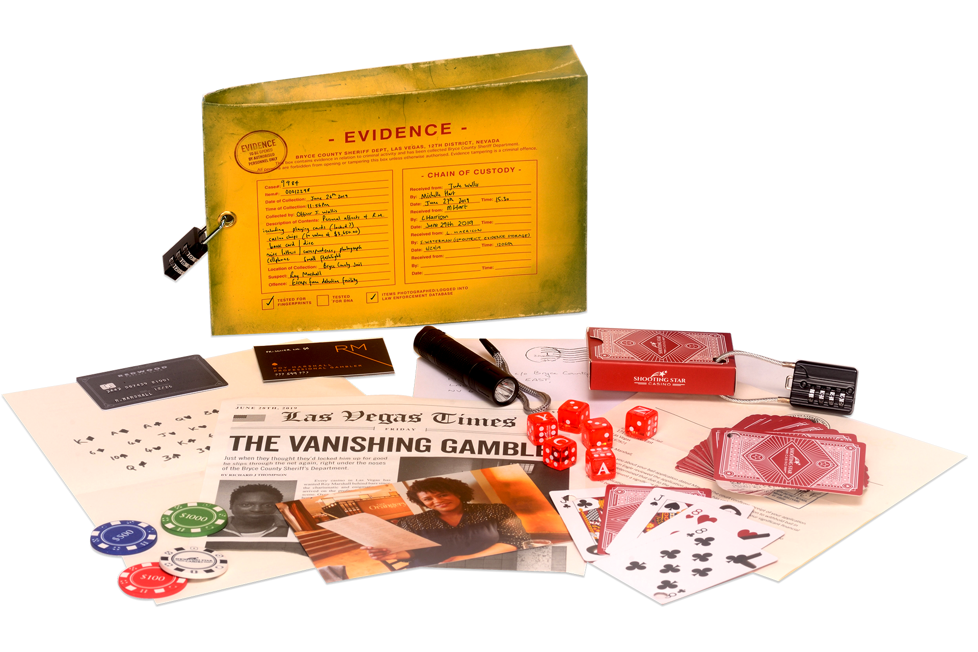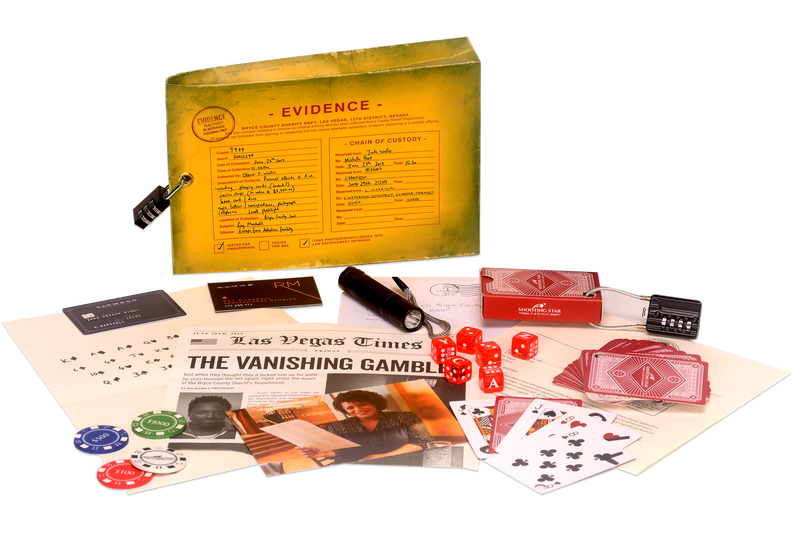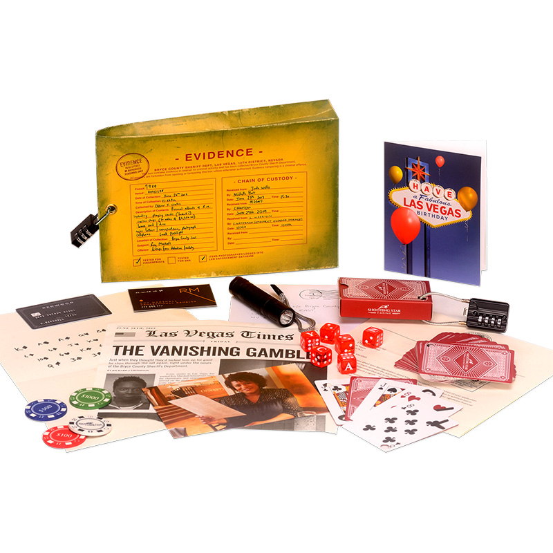 The Vanishing Gambler by The Mystery Agency is an escape-room puzzle to play at home. Themed around a missing casino cheat Roy Marshall, who vanished from his Las Vegas jail cell, you will need to use all your powers of deduction and logic to solve a baffling, mind mangling sequence of clues to crack combination locks, piece together the information and solve the mystery yourselves where the police have failed. You’ll need to hack into Roy’s bank account and even go undercover yourself. And it hasn’t been made easy for you – the document wallet itself has been padlocked and you will have to work out the combination just to get started! One of 3 new gripping mystery puzzles available from The Mystery Agency, which have won the Best Innovator award at the @etroomers Bullseye Awards 2021. The mastermind behind the puzzles is Olivier award-winner Henry Lewis, of the West End and Broadway hit, The Play That Goes Wrong and star of ITV’s brand-new Riddle-based quiz show ‘Riddiculous’ To solve The Vanishing Gambler you’ll need to launch an investigation across the pieces of evidence supplied in the box as well as discover secret websites that are hiding important clues. Over 25 life-like pieces have been beautifully designed with extraordinary attention to detail and the set even features authentic ceramic casino chips and an embossed credit card. The Vanishing Gambler is utterly compelling and thanks to the stunning tactile pieces, you will rapidly find yourself immersed into