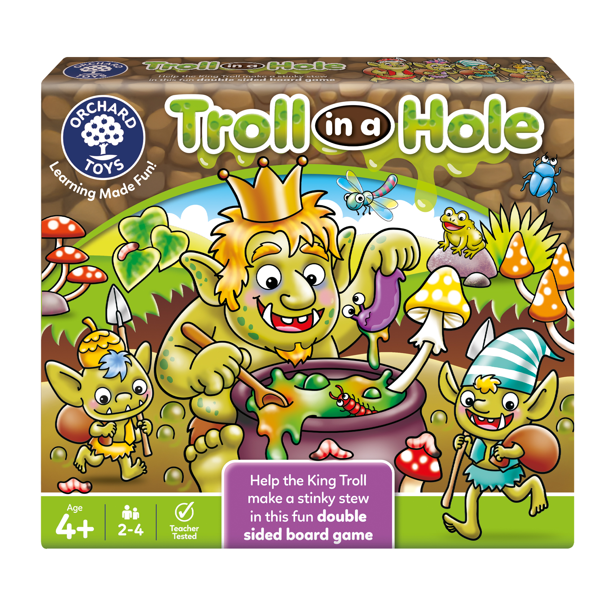 A laugh-out-loud adventure to cook up a stinky stew with hilarious interactive gameplay. In this fun and fast-paced educational board game, players race to collect colourful bug ingredients for King Troll’s gruesome stinky stew. Players move their troll along the colourful path, digging in the swamp, dodging hungry frogs, swapping slime cards, and even squelching in splatberries as they go, before leaping their troll into the 3D hole. This exciting double-sided 3D board game, features two ways to play - collect the most bugs, or flip the board over for a bonus colour matching game. There’s plenty of learning along the way, as Troll in a Hole entertains children while supporting their key developmental skills, helping children practise counting, number, and colour matching skills, and encouraging turn-taking and social skills. It’s a fun family game and great for the classroom too.