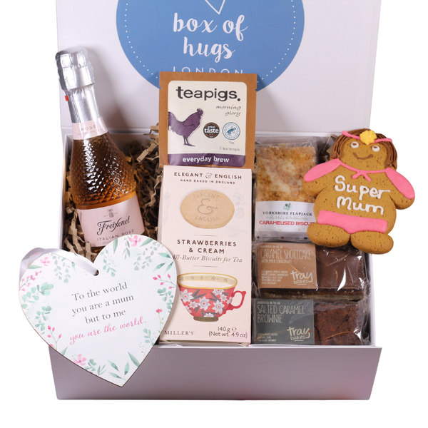 A luxurious afternoon tea-style gift box created especially for mums, the Sparkling Afternoon Tea and Treats for Mum Box of Hugs is a beautifully curated care package designed to make her feel celebrated and appreciated. Inspired by the founders’ memories of their mum’s amazing afternoon teas growing up, this lovely gift brings that same feeling of being treated, spoiled and cared for into a beautifully packaged box. It includes a mini bottle of sparkling wine, premium teapigs tea, indulgent sweet treats and a hand-decorated “Super Mum” gingerbread biscuit, all carefully arranged in a signature Box of Hugs gift box. Perfect for Mother’s Day, birthdays, thank you gifts or special surprises, this box offers a ready-made “afternoon tea at home” experience with a modern gifting twist and is designed for people who want to send something more thoughtful and memorable than flowers.