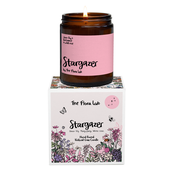 A floral fantasy that’s out of this world. Lovingly intertwined, fresh sheer Lily and delicate white Rose petals, along with a sprinkling of peach, results in Stargazer; an ethereal delight for the senses. Scent Notes Top Notes ;Bergamot, Plum, Peach, White Rose Middle Notes: ;Lily, Rose, Ylang, Jasmine Base Notes: Cedar, Sandalwood, Amber, Musk Hand Poured with a coconut and rapeseed wax. Burn time of 30-35hours.