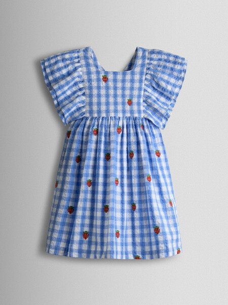 Keywords Blue , Buttons Up At The Back , Dress , Frill Sleeves , Gingham , Spring , Square Neckline , Strawberry Embroidery , Summer