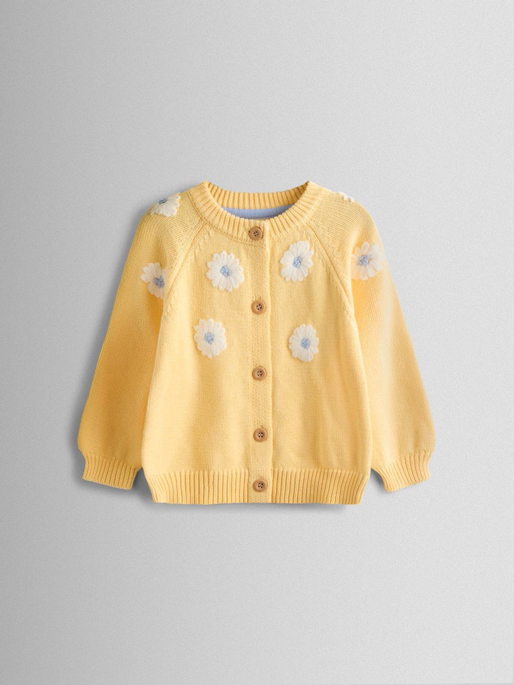 Keywords Cardigan , Daisies , Daisy Embroidery , Embroidered , Five Button Front , Floral , Long Sleeved , Pastel , Pastel Yellow , Round Neckline , Spring , Summer , Yellow