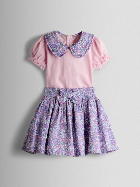 Keywords 2 Piece Set , Bow Detail , Easter , Easy Dressing , Floral Print , Frilled Edge , Jersey , Peter Pan Collar Poppers On The Back , Pink , Purple , Short Puffy Sleeves , Spring , Stretchy Waistband , Summer , Super Soft , Sweet , Top And Skirt Set