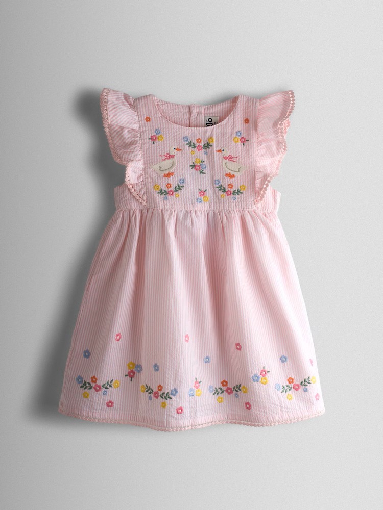Keywords Buttons Up At The Back , Dress , Duck & Flower All-Over Embroidery , Duck Embroidery , Ducks , Easter , Embroidered , Flower Embroidery , Flowers , Frill Shoulders , Pink , Pinstripe , Rounded Neckline , Seersucker , Spring