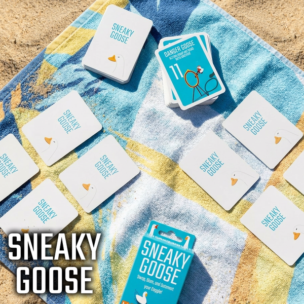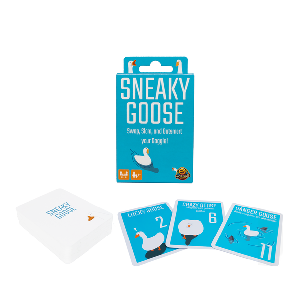 Sneaky Goose is a quick-thinking memory card game where players race to finish with the lowest score. Swap, steal and shed cards while trying to remember what’s in front of you, and what your opponents are hiding. Easy to learn but hard to master, Sneaky Goose blends memory, timing, and clever tactics. Players must decide when to swap cards, swap grids, and when to "HONK" to end the round before anyone else can improve their hand. Perfect for kids, friends, families, travel, and holidays, the compact game is designed for fast, flexible pick up and play. Enjoy a quick round when you’re short on time, or keep the fun going with multiple rounds, all in one compact package. No pen or paper? No problem. Sneaky Goose includes a free online score tracker to keep the game moving wherever you play. Portable, addictive, and full of surprising tac-tics, Sneaky Goose is the card game that keeps everyone on their toes.