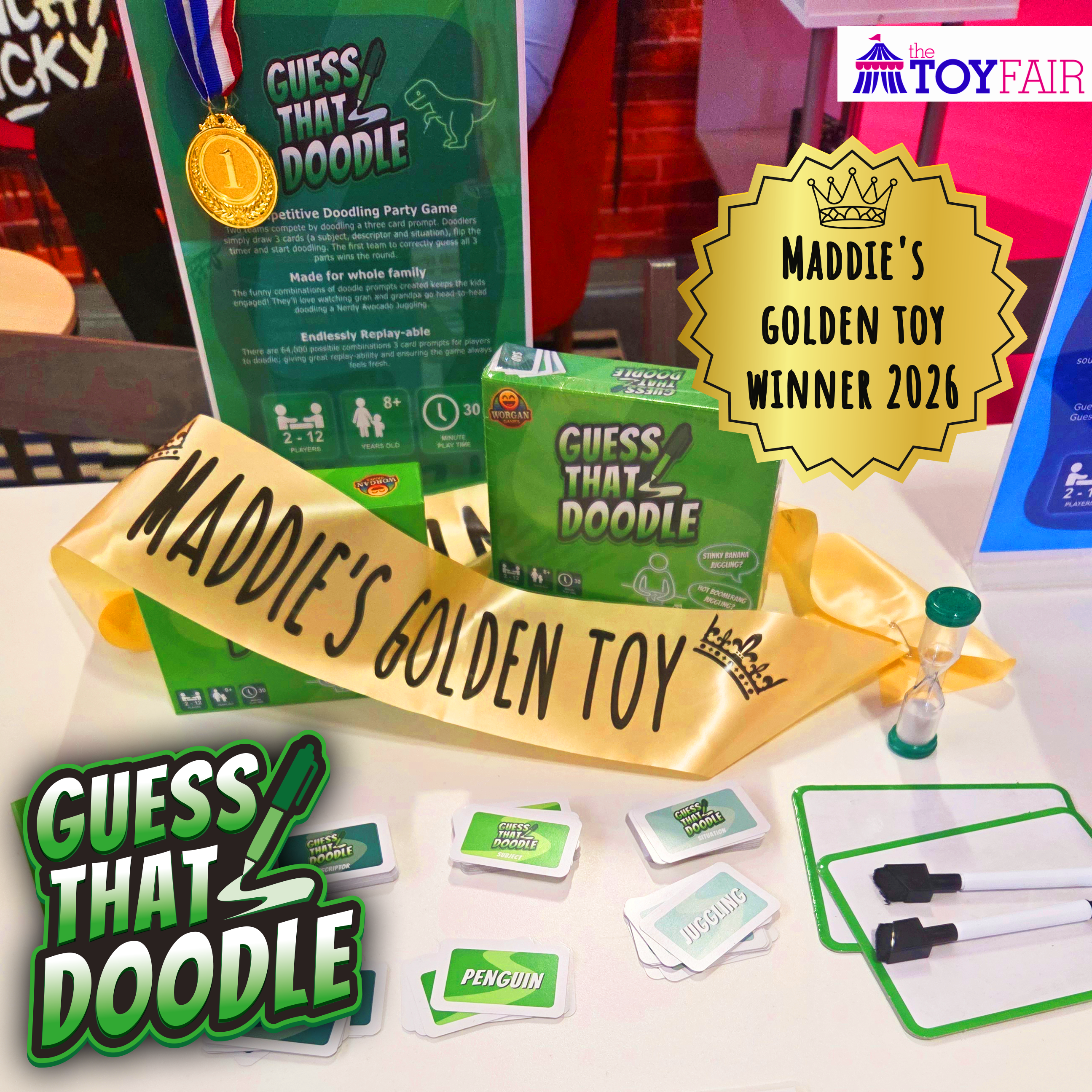 Guess That Doodle is a fast-paced competitive doodling party game where players race against the clock to draw ridiculous combinations while their teammates try to guess them. Draw three prompt cards, flip the 60-second timer, and start sketching, the first team to guess all three parts correctly wins the round. You don’t need to be an artist to play. The prompts are simple, silly, and accessible for players of all abilities, which makes the game perfect for family parties and mixed-age groups. Even younger players can join the fun by guessing the increasingly absurd doodles being drawn. With 120 prompt cards creating over 64,000 possible doodle combinations, every round brings something new, whether it’s someone trying to draw a Nerdy Avocado Juggling or another bizarre mash-up. The game includes dry-wipe whiteboards, pens with erasers, and a sand timer for quick setup and endless replayability. Winner of Maddie’s Golden Toy Award at London Toy Fair 2026.