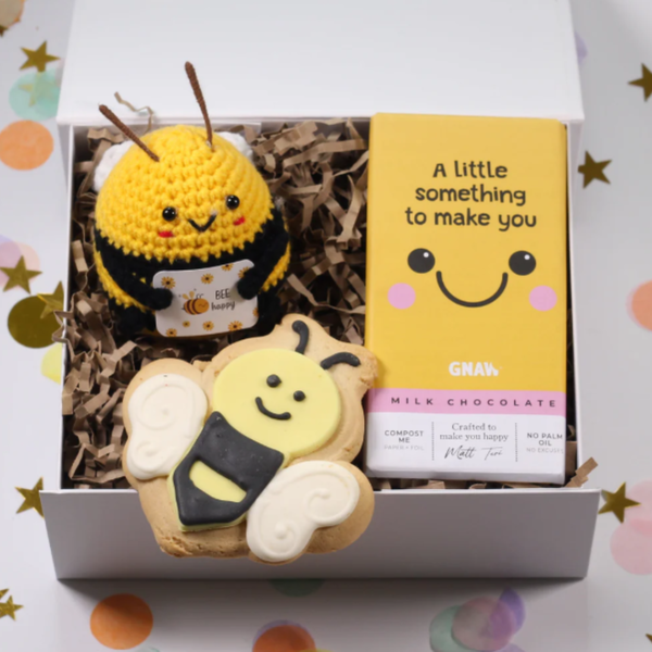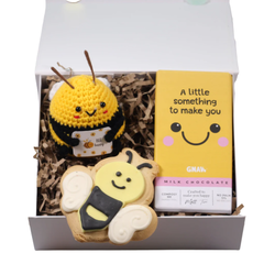 Brighten someone’s day with our Mini Cheer Up Gift Box – Bee Happy Positivity Care Package – a cheerful little bundle of positivity designed to bring smiles, encouragement and a sweet moment of joy. Whether you're sending a thinking of you gift, a pick-me-up present, a get well soon surprise or just a little box of happiness, this thoughtful gift is perfect for reminding someone they’re loved and supported. Inside this beautifully curated gift box they’ll discover an adorable crochet bee companion, delicious treats and the option to add a relaxing self-care extra. Every element has been chosen to create a small but meaningful moment of comfort and positivity. All of the products in our beautiful boxes have been lovingly selected and are hand packed in a keepsake magnetic white box. Each box includes a card, which you can add a personalised message to, making your hug even more special.