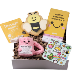 Send a comforting hug through the post with our uplifting Mini Tea Gift Box – Little Positivi-tea Cheer Up Care Package– a thoughtful gift designed to brighten someone’s day and remind them they’ve got this. Perfect as a thinking of you gift, encouragement gift, get well soon present, exam good luck gift, or just-because surprise, this cheerful box combines positivity, sweet treats and comforting moments in one beautifully curated package. Every item has been chosen to bring a smile – from the adorable crochet companion and delicious chocolate to the inspiring coaster filled with cheerful “positivi-tea” messages. All of the products in our beautiful boxes have been lovingly selected and are hand packed in a keepsake magnetic white gift box. Each box includes a card, which you can add a personalised message to, making your hug even more special.