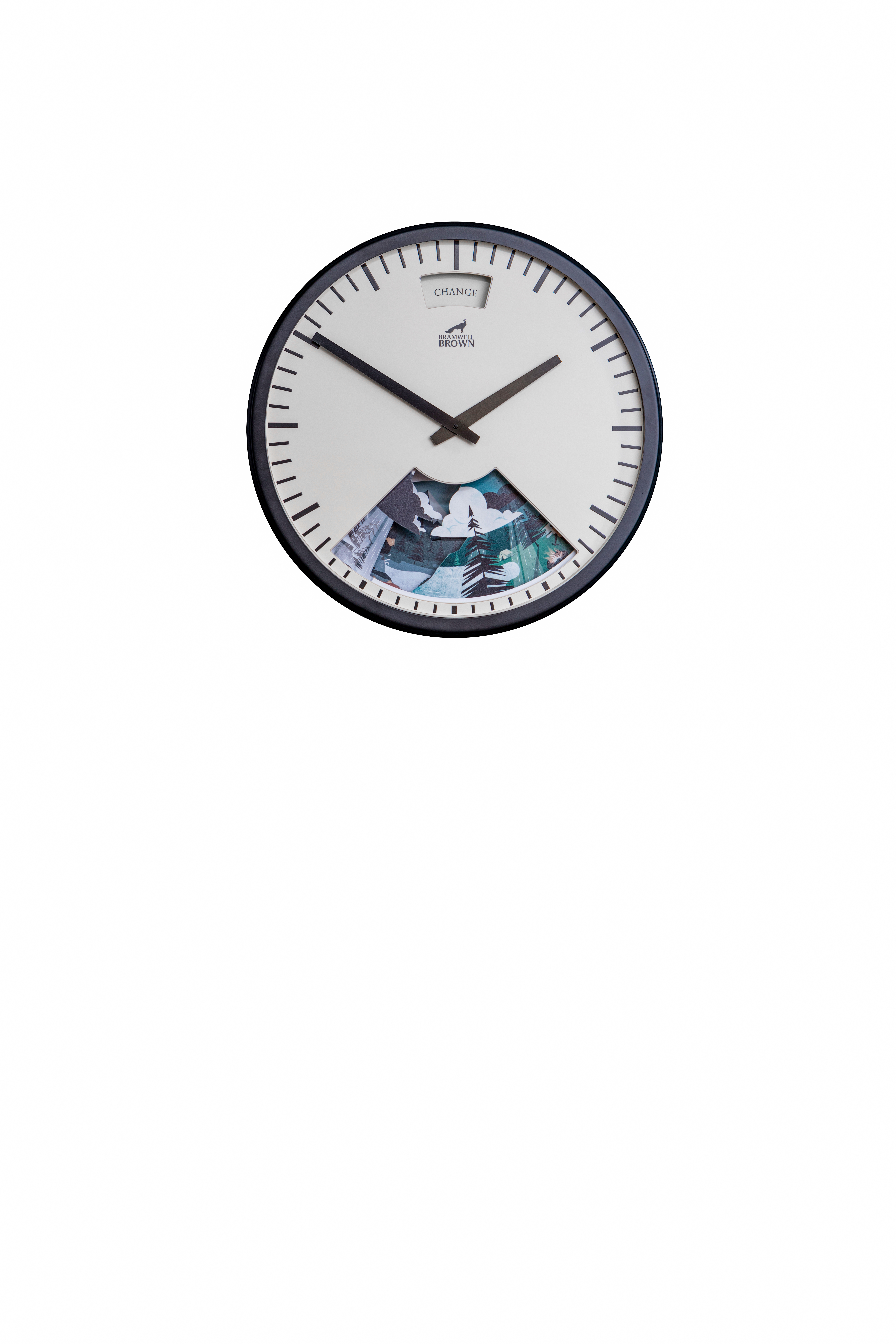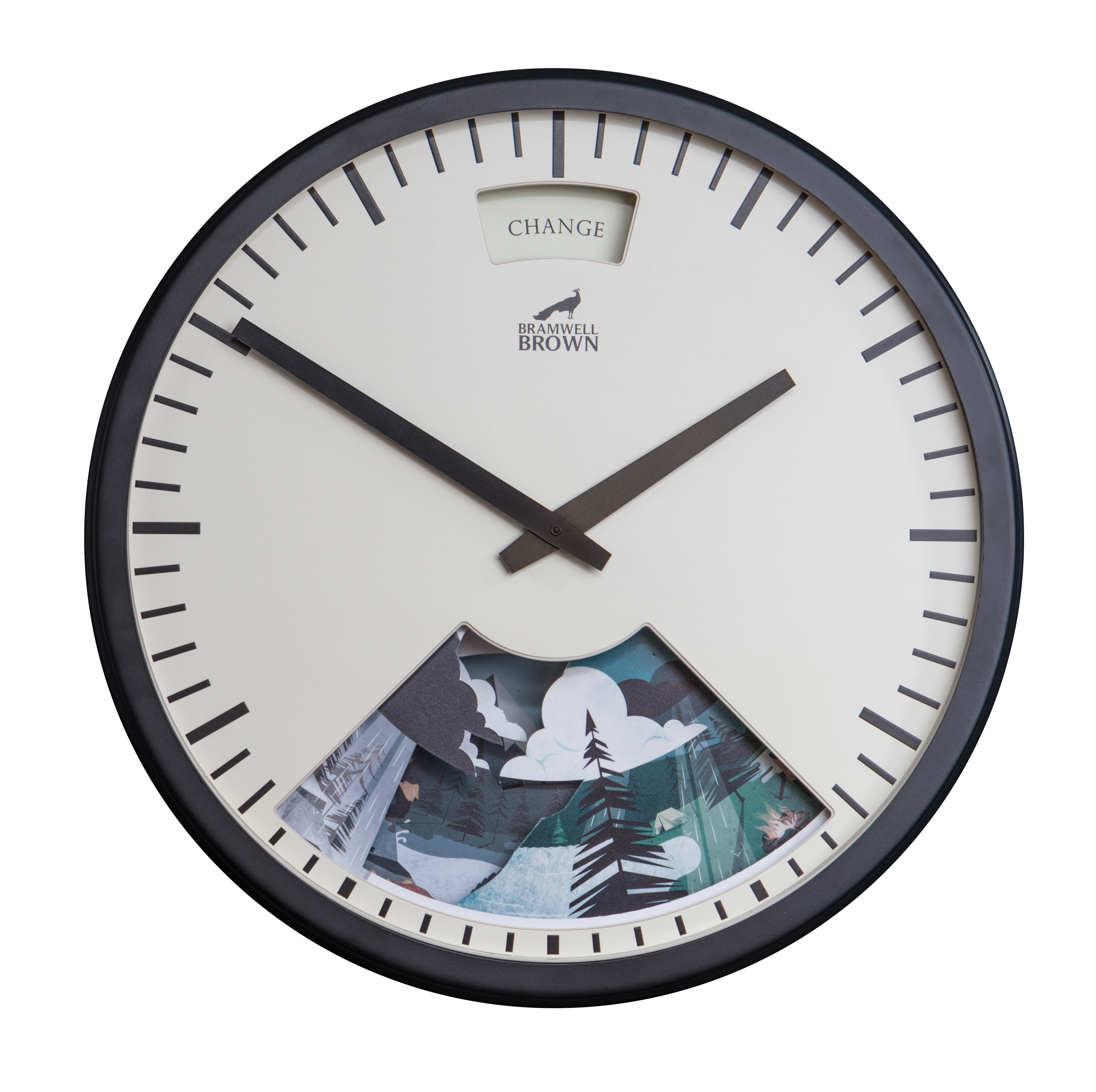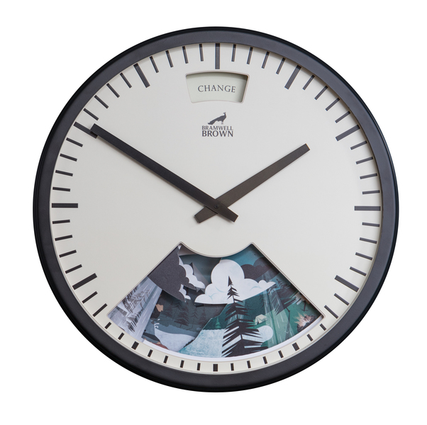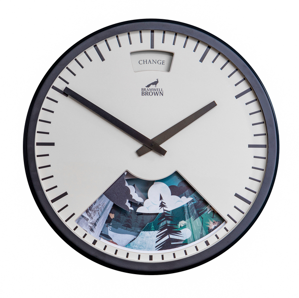 New for Autumn/Winter 2017 the 'Into the Wild' Weather Clock with clever integrated barometer. ‘Mechanimated’ has been created by artist Josh Patterson. Inspired by a trip to Canada, Patterson fell in love with the Canadian atmosphere and scenery and it's reflected in this unique clock. Available with a black, blue, grey, or copper frame and designed and built in Britain.