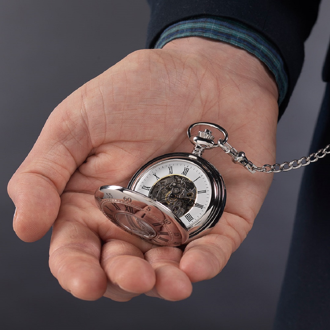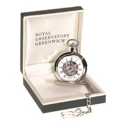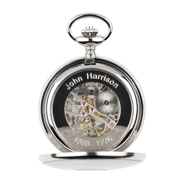A stunningly crafted gold pocket watch and Albert chain, inspired by John Harrison’s world changing chronometer. This quality timepiece features a double opening Hunter style case and skeleton feature able to display the beautifully complex 17 jewelled mechanical movement within. The watch can also be hung on a pocket watch stand making this an elegant addition to your desk or mantelpiece. 1 year guarantee for manufacturing faults. Comes with a presentation gift box.