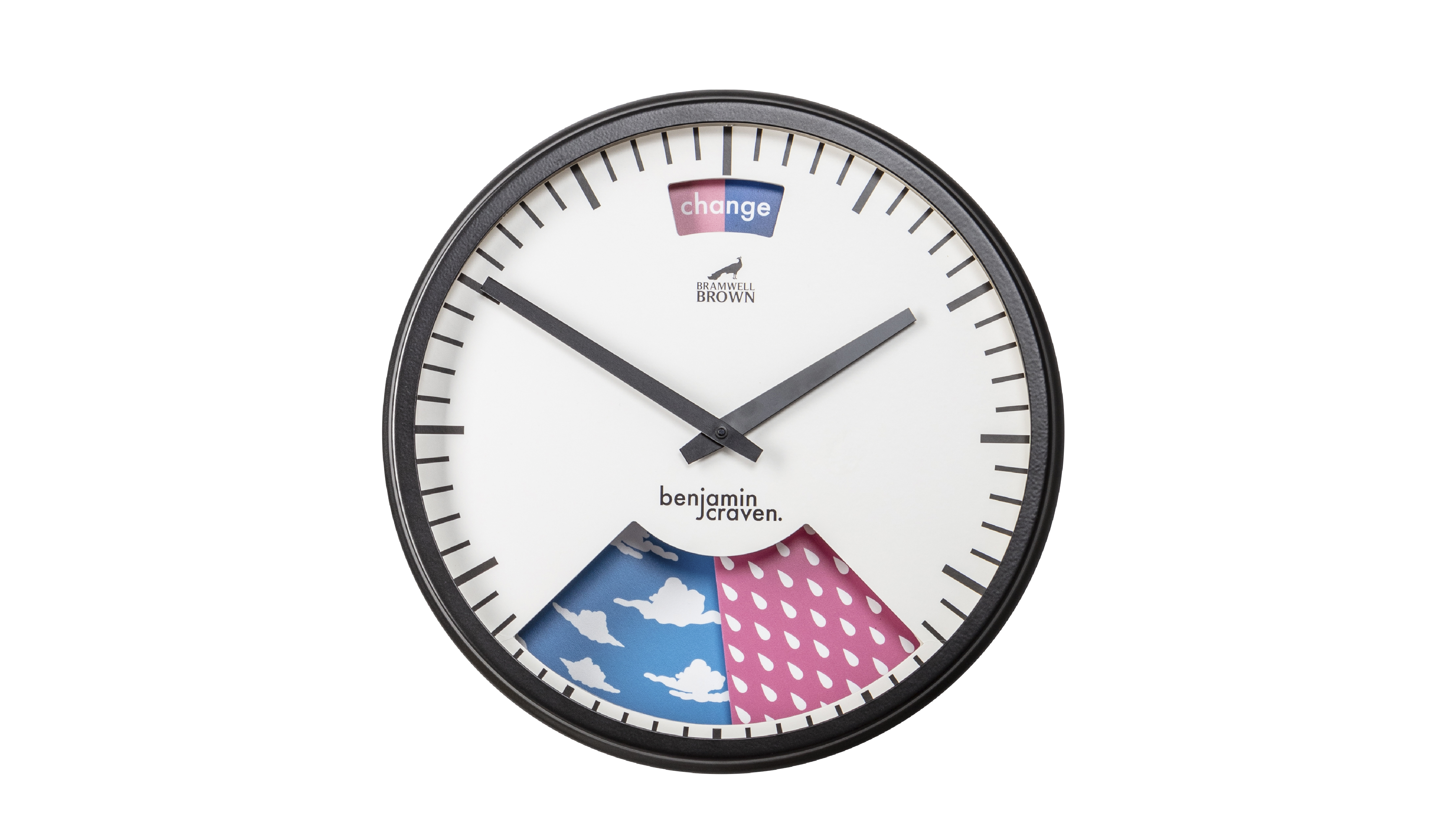 This very special Weather Clock has had its weather scenery designed by the young British artist, Benjamin Craven. The polka dot rain showers and bluebird skies mark a change in creative direction for Bramwell Brown. Limited to only 250 clocks and available in solely midnight Black frames, this is a piece of horological history.