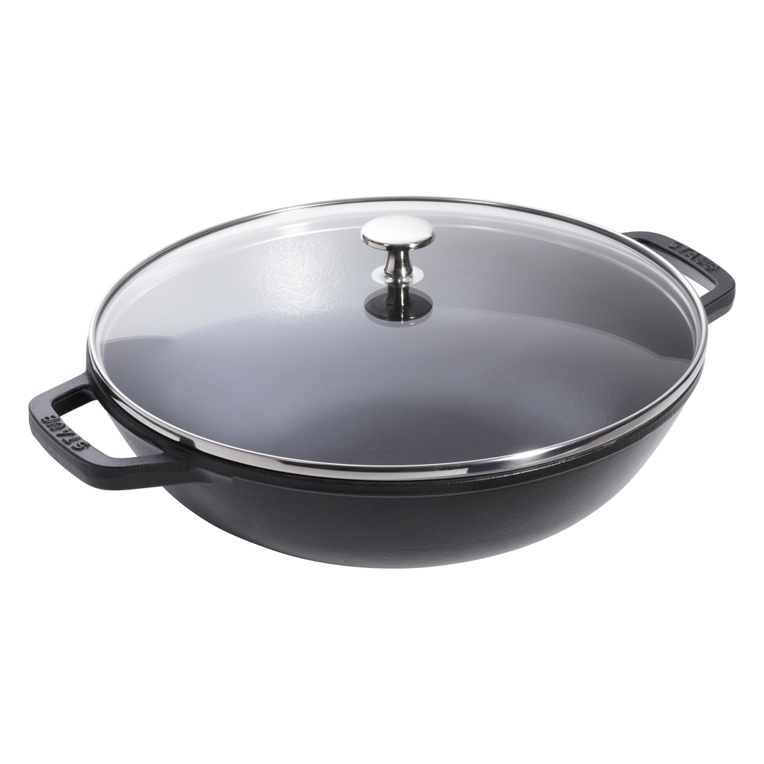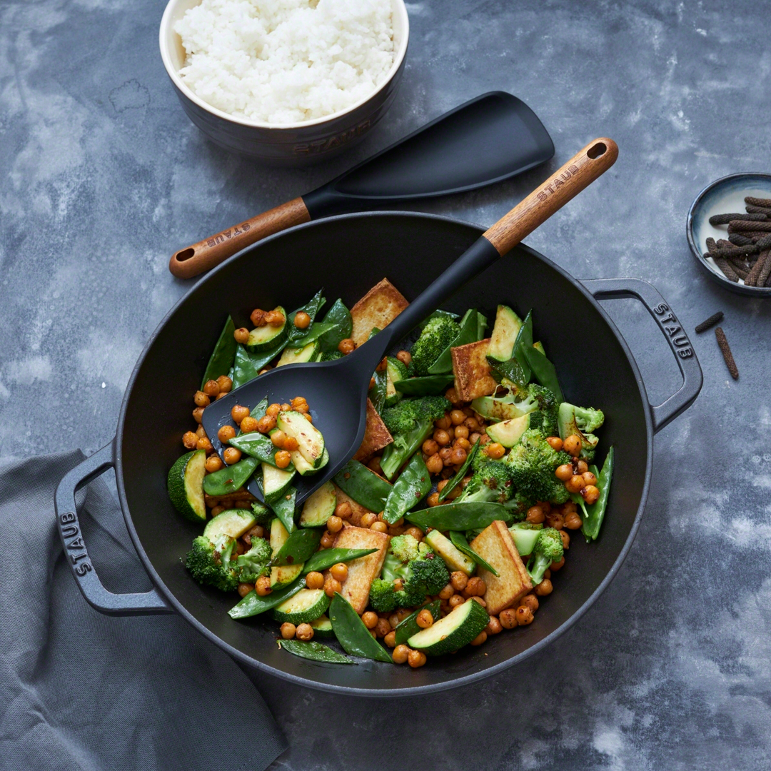 Short-handled cast iron wok, perfect for stir-frying noodles, meat and vegetables, or for deep-frying crispy tempura prawns or courgette. Induction friendly.
