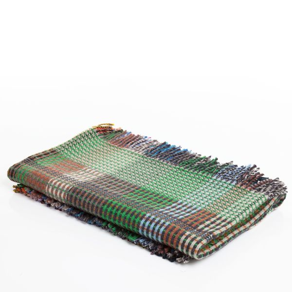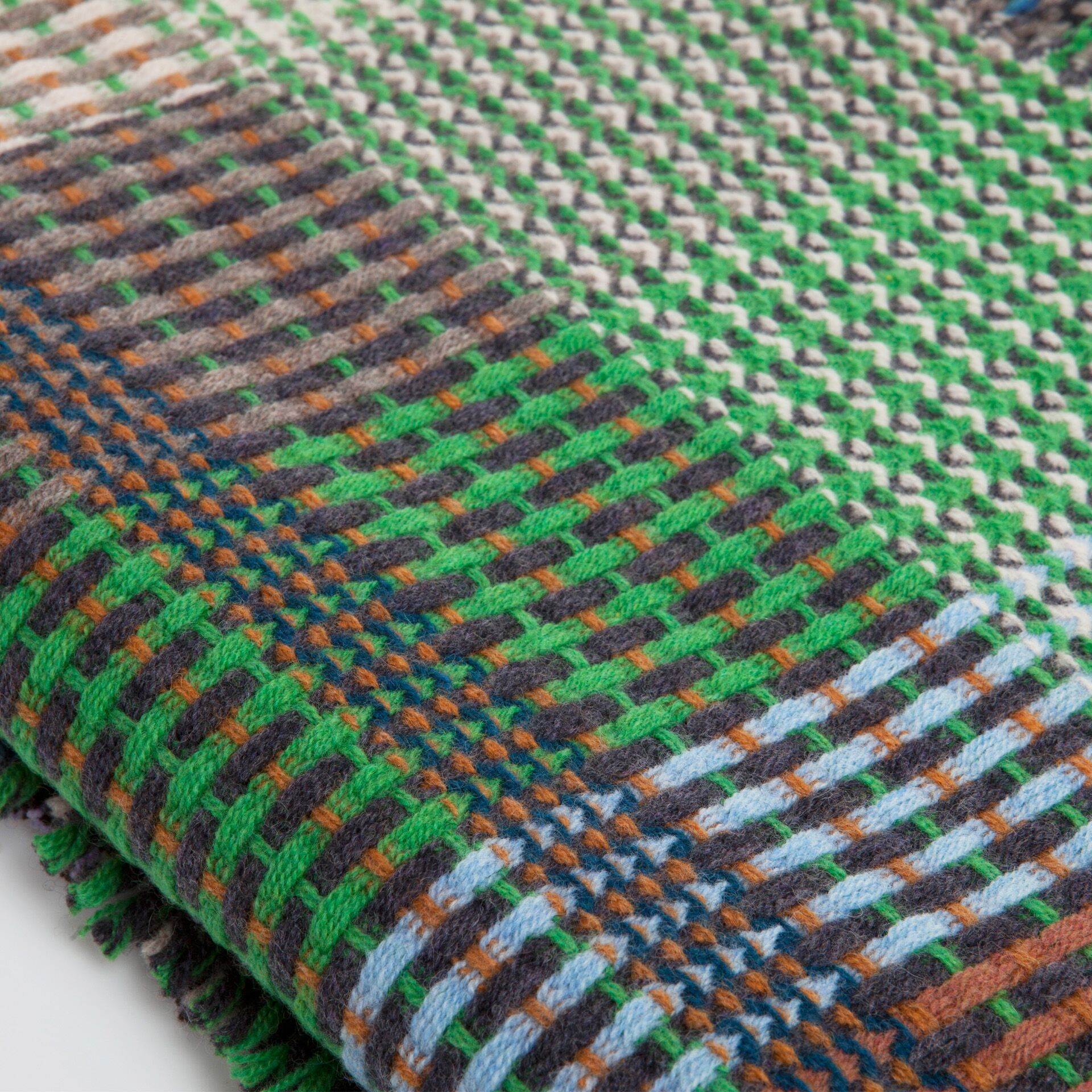 A lighter weight throw, woven in merino lambswool, with a pixelated motif running throughout, that contrasts with a tweed-patterned border.