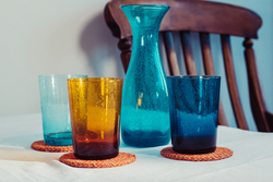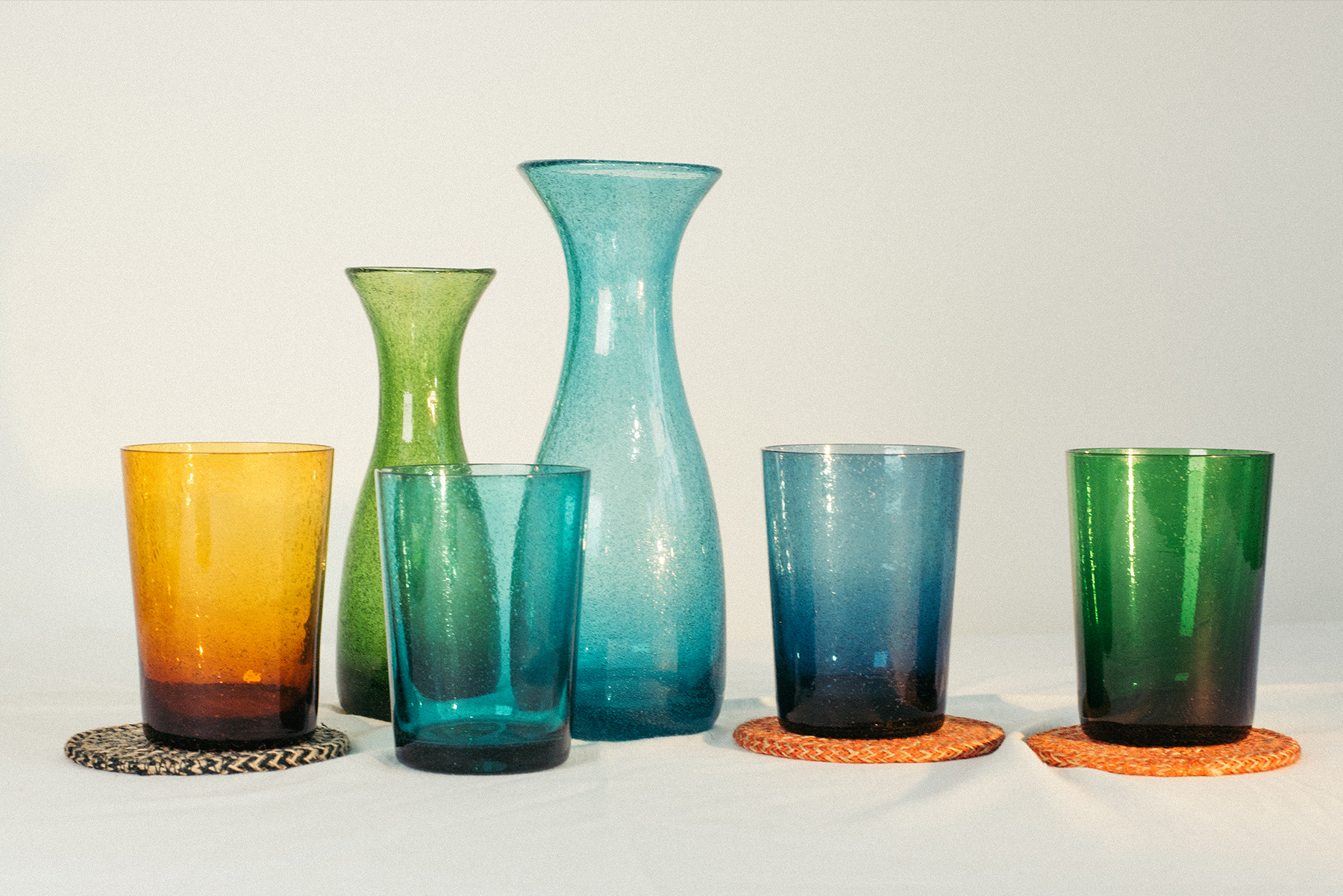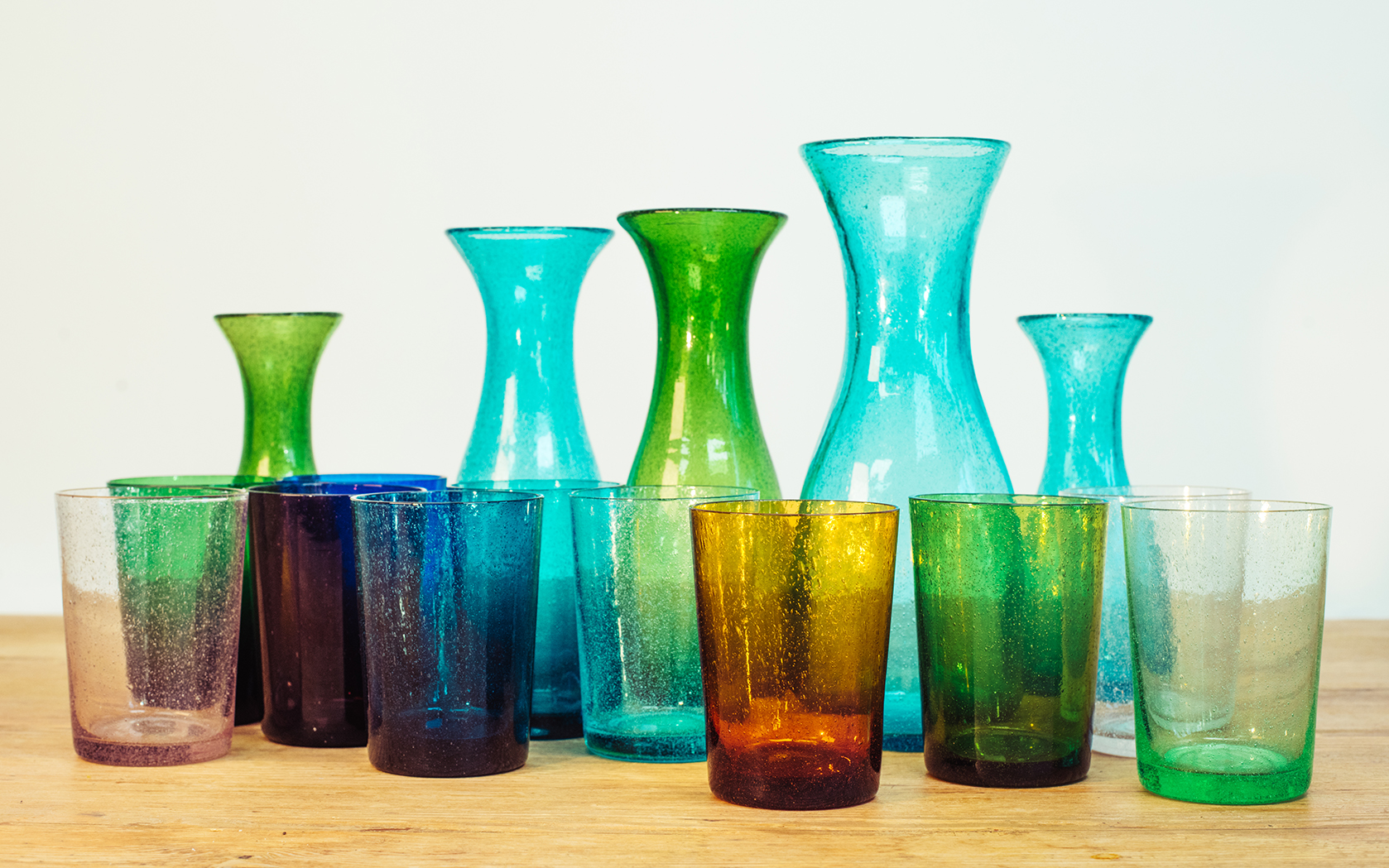 A classic carafe shape available in 3 sizes, 25 Clt, 50 Clt or 1 L. Handmade from recycled glass. Every piece is handblown by skilled artisans and no two are exactly alike. Mix and match across the 3 sizes and colours of carafes to set the table alive with colour. Hundreds of tiny air bubbles in the glass create a light, bubbly effect and add to the uniqueness of this charming range designed for every-day dining. Derived from the beautiful vintage British Colour Council system of the 1930's; we use the names and colours from the original Dictionary of Colour; consisting of 100's of vibrant dyed ribbons originally created to colour-match products across The Commonwealth - from uniforms to postboxes, bunting to battleships. £24, £18 & £12 depending on the size.