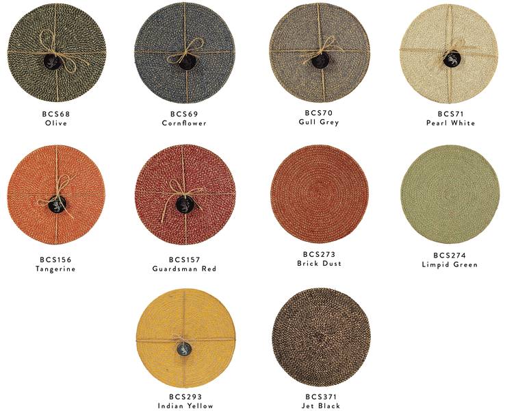 Sets of 4 woven, natural jute placemats & also colour-matching coasters made from natural, sustainable eco fibres by skilled artisans. No two pieces are exactly alike, suitable for everyday dining. Reproduced using colours found in our original 'Dictionary of Colour' first established in 1931. British Colour Standard© colours are dyed into the jute and woven to make these special coasters which look fantastic in the traditional or modern home. Many are matched to flora & fauna, precious stones & minerals. Add our matching jute mats and recyced glasswares and create your own colour story at home. Made in Bangladesh, the factory is Fair Trade accredited and the local community is well supported by the owners - including the orphanage that they sponsor. Available in Tangerine, Guardsman Red, Pearl White, Gull Grey, Olive Green, Cornflower Blue, Brick Dust, Limpid Green, Indian Yellow & Jet Black.