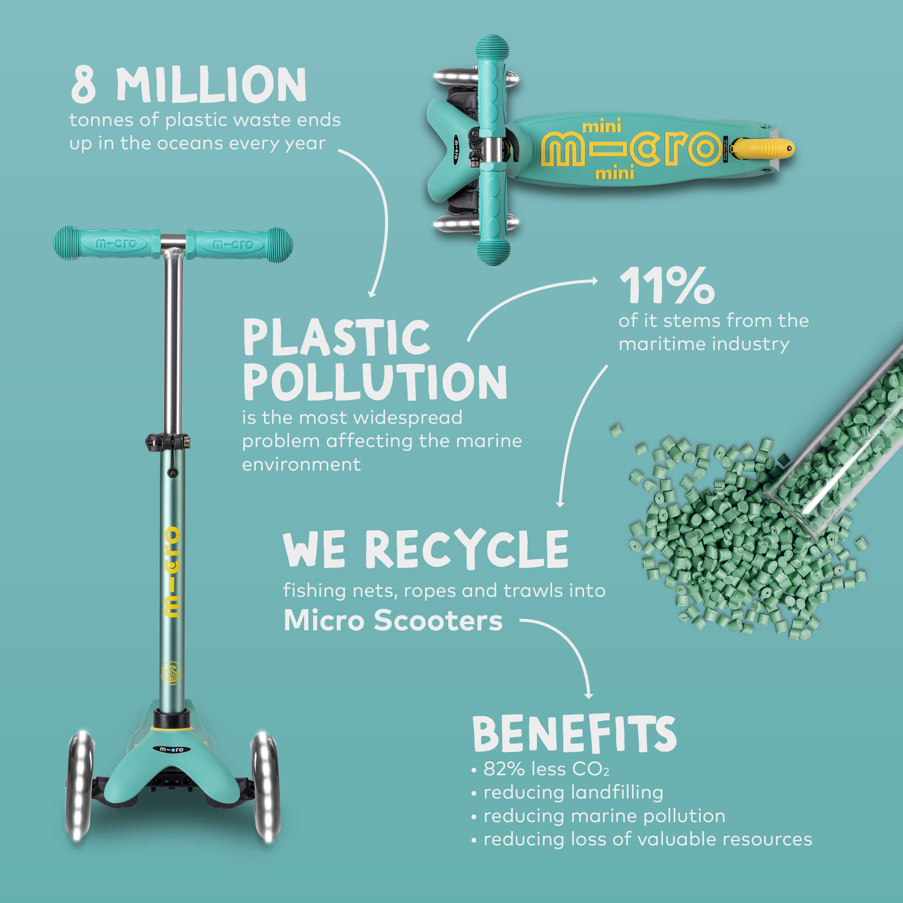 At Micro we believe it is our responsibility to do as much as we can to have a positive impact on people and the planet. So we are proud to launch our new range of Eco scooters - the deck is made using discarded fishing nets. This new Eco version now includes battery-free light-up wheels. These clever LED wheels use induction energy to turn the power kids create as they scoot into bright white light. For never-ending light-filled adventures. The colour pop anodised stem not only stands out from the crowd but survives the toughest of knocks. With our innovative braking system that responds to the slightest touch, toxin-free handle grips that are soft yet strong and polyurethane, puncture-free wheels for endless adventures. An adjustable handlebar means the scooter will grow with your child. Complete with the Swiss design and engineered build quality Micro are renowned for, the highest spec materials and of course our replacement part guarantee. Now your child cannot just explore the planet - but protect it too.