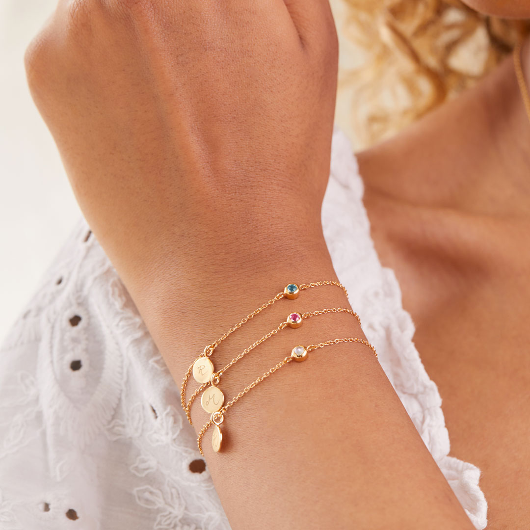 New to our birthstone family, our birthstone bracelets make a simple statement. Choose from 12 birthstones, and add a dangling disc charm to hand-engrave up to 1 initial to personalise further. Pair up with our birthstone necklace to complete the set.