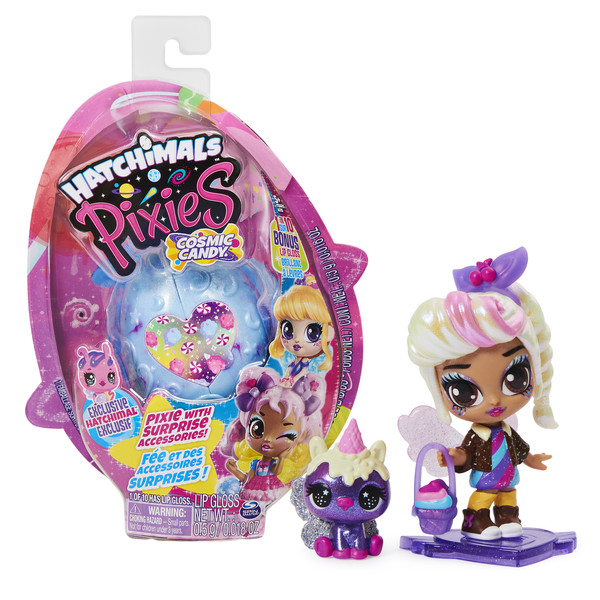 Hatch your perfect Cosmic Candy Pixie and a matching Hatchimal! These super stylish Hatchimals Pixies have a unique look, with outfits and accessories inspired by marshmallows, candyfloss, doughnuts and more! And, for the first time, each Cosmic Candy Pixie comes with a matching exclusive CollEGGtible! There are four Cosmic Candy mystery features to discover: glow-in-the-dark, fuzzy, iridescent and gummy; and even more surprises: two accessories, a whole new hatch and a reusable egg! First, peel off the heart sticker to reveal a symbol hinting at her feature. Hatch the heart to get a sneak peek at your colourful friend, then open up each side of the egg to meet your trendy Pixie and Hatchimal! Will you hatch Gummy Gwyneth, Lollipop Lizzie, Marshmallow Mackenzie? With eight Pixies to collect from four different eggs, you’ll find one of two possible Pixies inside. Featuring poseable heads and magical glittery wings, Cosmic Candy Pixies are a treat to collect! Accessorise your fashionable Pixie with her pretty accessories like a doughnut handbag, marshmallow hat, gummy sweets headband and more! Then, decorate your egg with the stickers and use it as a fun display for your new friends – there’s a printed backdrop inside, making it the perfect cosmic hangout! There are eight Cosmic Candy Pixies (each sold separately) to add to your collection. Hatch your own out-of-this-world Cosmic Candy Hatchimals Pixie!