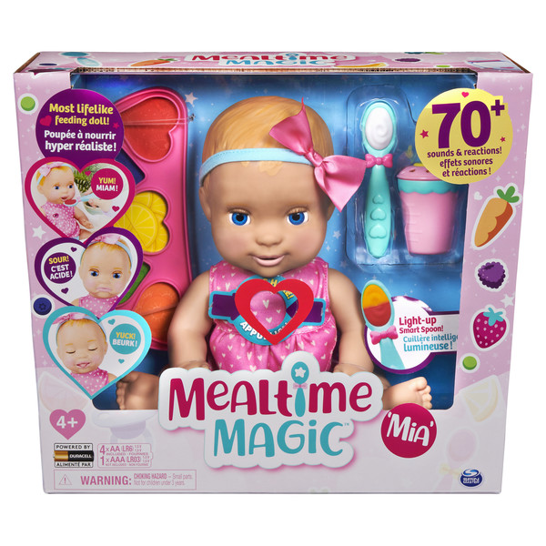Discover Mealtime Magic Mia, the most expressive and lifelike feeding baby doll! Mealtime is Mia’s favorite time of day. She really recognizes and reacts to the foods you feed her, with over 70 sounds and phrases! When she’s hungry, she’ll call out to you. Using her special light-up smart spoon and double-sided food tray, there are 10 different foods you can mix and match! Discover Mia’s lifelike reactions as she recognizes and recalls over 50 food combinations. It’s all the feeding fun, without the mess! ike a real baby, Mia opens her mouth to say “ahh” when she’s ready to eat. Bring the spoon to her mouth and watch as she reacts! Will it be yum or yuck? Will she playfully stick out her tongue if it’s too sour? Change up the food combinations and discover all of your baby’s exciting expressions and reactions as you feed her again and again! Over time, you’ll learn Mia’s favorite foods as she asks for them more and more! If you feed Mia too much, she can get a little fussy. Gently pat her on the back to burp her! After mealtime comes playtime. Tickle Mia’s chest for sweet giggles or bounce her back and forth as she smiles with excitement! Mia’s interactive 2-in-1 accessory doubles as a bottle and pacifier. Feed her with her bottle as you rock her to sleep in your arms. She really suckles on it!