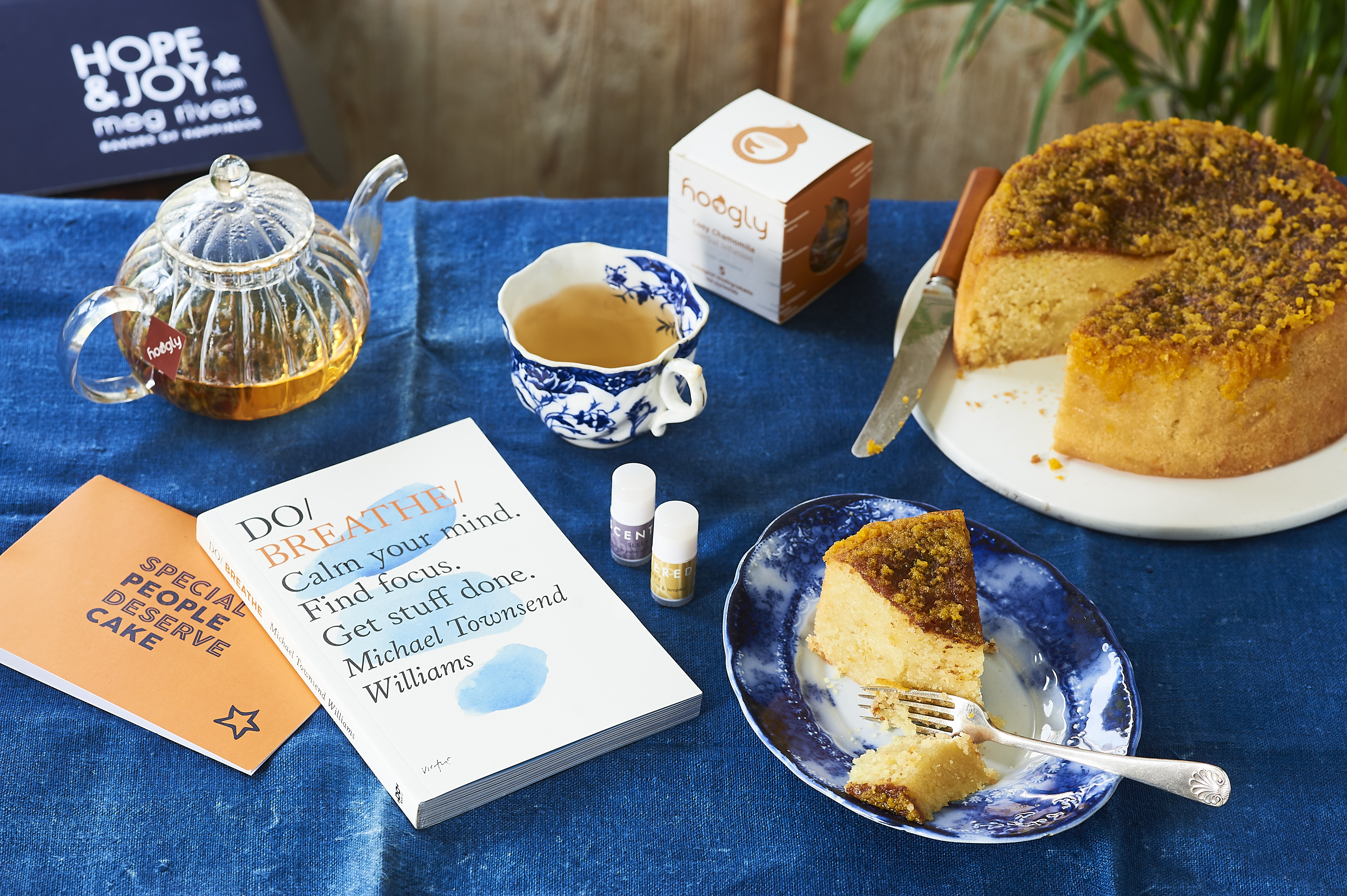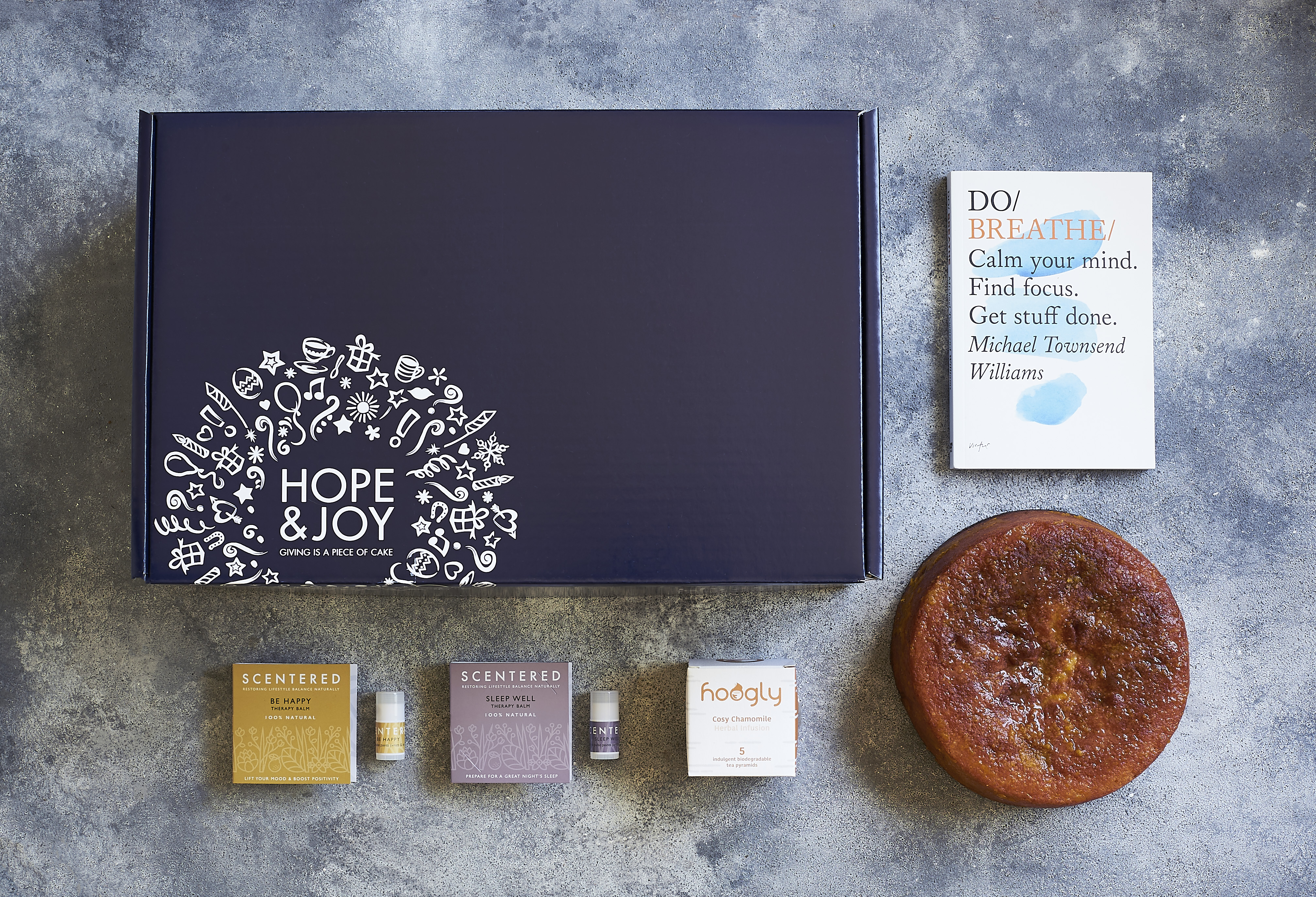 Our Relax Hamper includes lots of treats to indulge that someone special in your life. Our Clementine & Almond is now one of our most popular cakes, and it’s not hard to see why! Made using lots of ground almonds for a moist , dense texture. Then, whilst still warm from the oven, we ladle copious quantities of the super citrus syrup all over it. Absolute ‘JOY’ in a cake! But that's not all - the box also includes 5 amazing tea pyramids of relaxing 'Cosy Chamomile' tea from the lovely folk at Hoogly a copy of 'Do Breathe' book by Michael Townsend Williams two scented therapy balms, 'Be Happy' and 'Sleep Well' from the clever people at Scentered a free greetings card - choose your design from above On top of all this loveliness, your gift will include a £5 donation to Teenage Cancer Trust. Bringing ‘Hope’ to young people living with cancer. Such a lovely way to show someone you love them and support a wonderful charity as well.