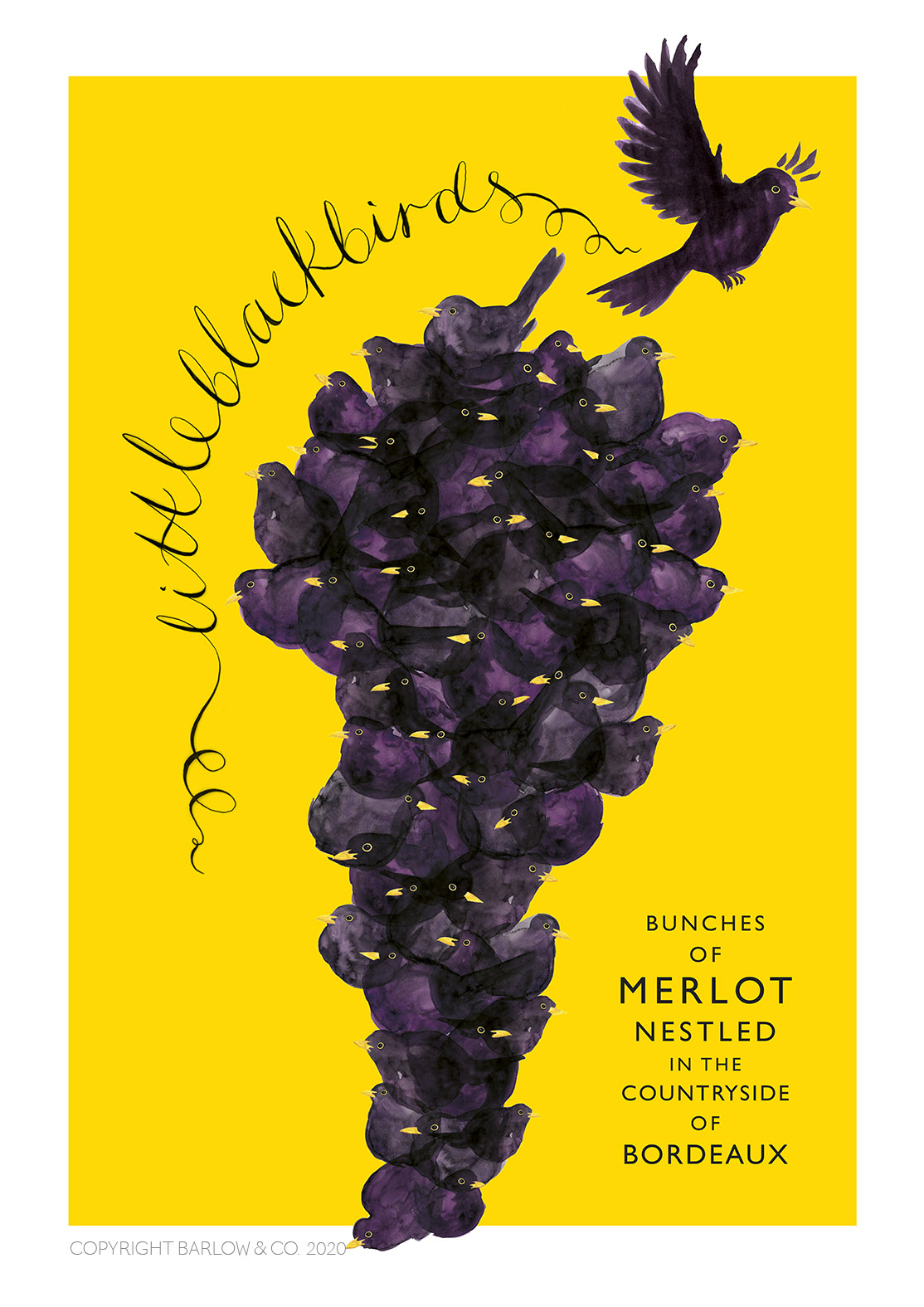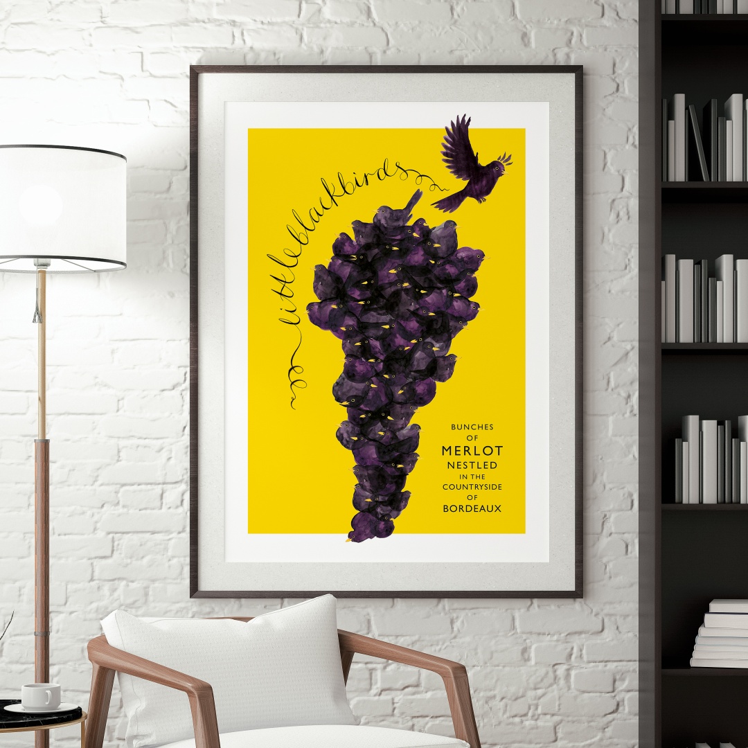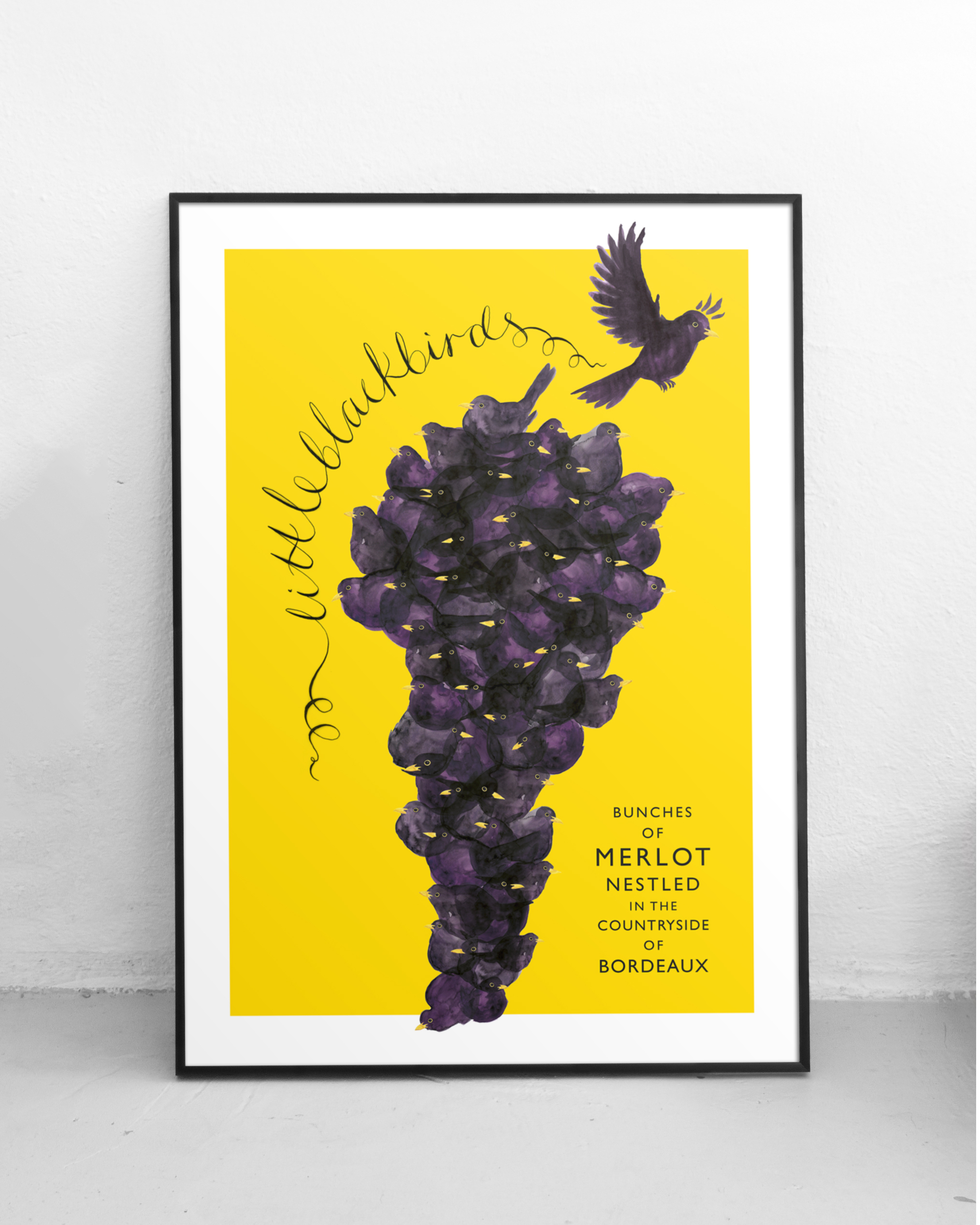 Merlot is French patois for ‘little blackbirds’. Some say this is due to the grapes’ blue-black colour, others think it’s because these cheeky birds enjoy gobbling up all the grapes! Perfect gift for wine lovers, cooks, lockdown wine converts, visual artwork collectors and the typically challenging men’s Christmas gift category. Printing is to art standard on archival paper using Ultrachrome inks for incredible depth of colour and longevity. Delivery between 2-5 days. Sizes and prices: A4 (210 x 297mm) £30, A3 (297 x 420mm) £50, A2 (420 x 594mm) £80, A1 (594 x 841mm) £140. All the prints are sold unframed, but we do offer a framing service. Prices are dependent on what the specification is, but to give an example, an A3 framed print would be an extra £50. Contact help@wineartshop.com for more info.