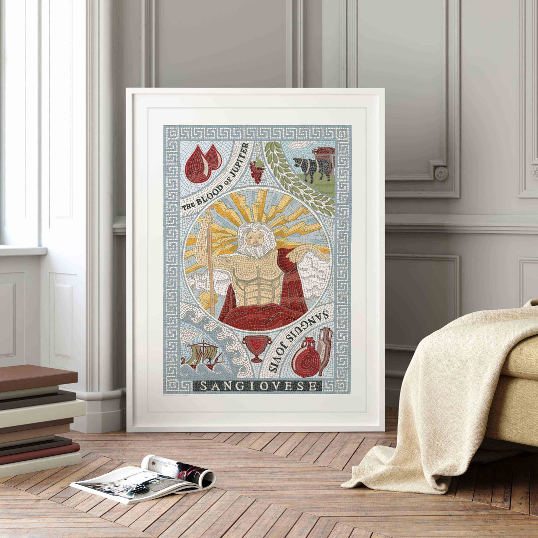 With its deep red tones, the Sangiovese grape derived its name from the Latin, sanguis Jovis - ‘The Blood of Jupiter’. In Ancient Roman mythology, Jupiter was known as the King of the Gods; ruler of the sky, lighting and thunder and is the inspiration for our mosaic. Perfect gift for wine lovers, cooks, lockdown wine converts, visual artwork collectors and the typically challenging men’s Christmas gift category. Printing is to art standard on archival paper using Ultrachrome inks for incredible depth of colour and longevity. Delivery between 2-5 days. Sizes and prices: A4 (210 x 297mm) £30, A3 (297 x 420mm) £50, A2 (420 x 594mm) £80, A1 (594 x 841mm) £140. All the prints are sold unframed, but we do offer a framing service. Prices are dependent on what the specification is, but to give an example, an A3 framed print would be an extra £50. Contact help@wineartshop.com for more info.
