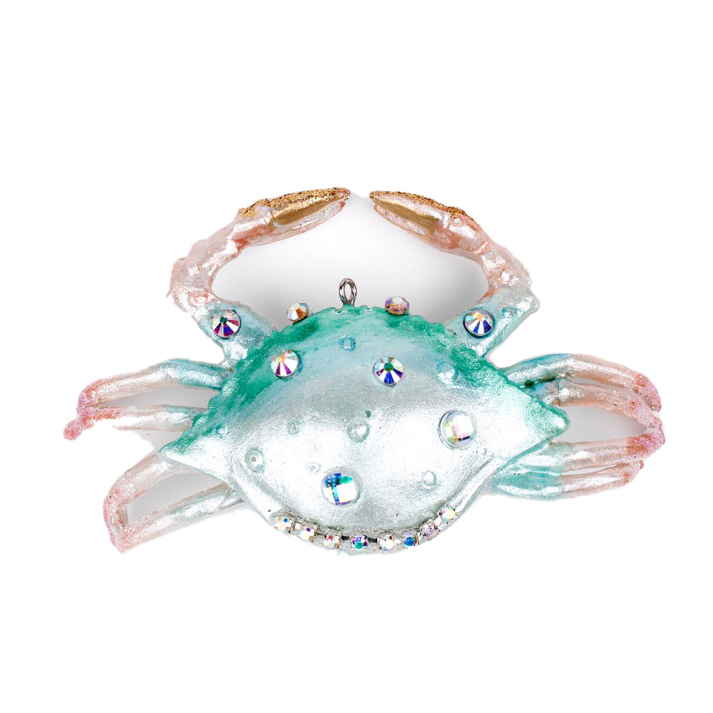 This crab design Christmas decoration will transport your tree to an underwater world. In shimmering blue and pink, this decoration is bedazzled with gems and glitter for a luxe finish. Hand painted Material: resin Dimensions: H7xW10xD3cm