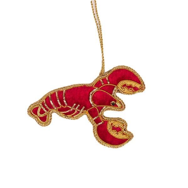 Add a touch of ocean life to your festive decor with a fun Christmas tree decoration in the form of a lobster. The charming crustacean is hand embroidered with gold thread. A fun way to celebrate life under the sea this festive season and an update on more traditional baubles. Fabric