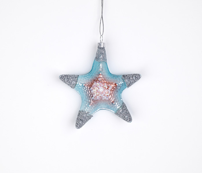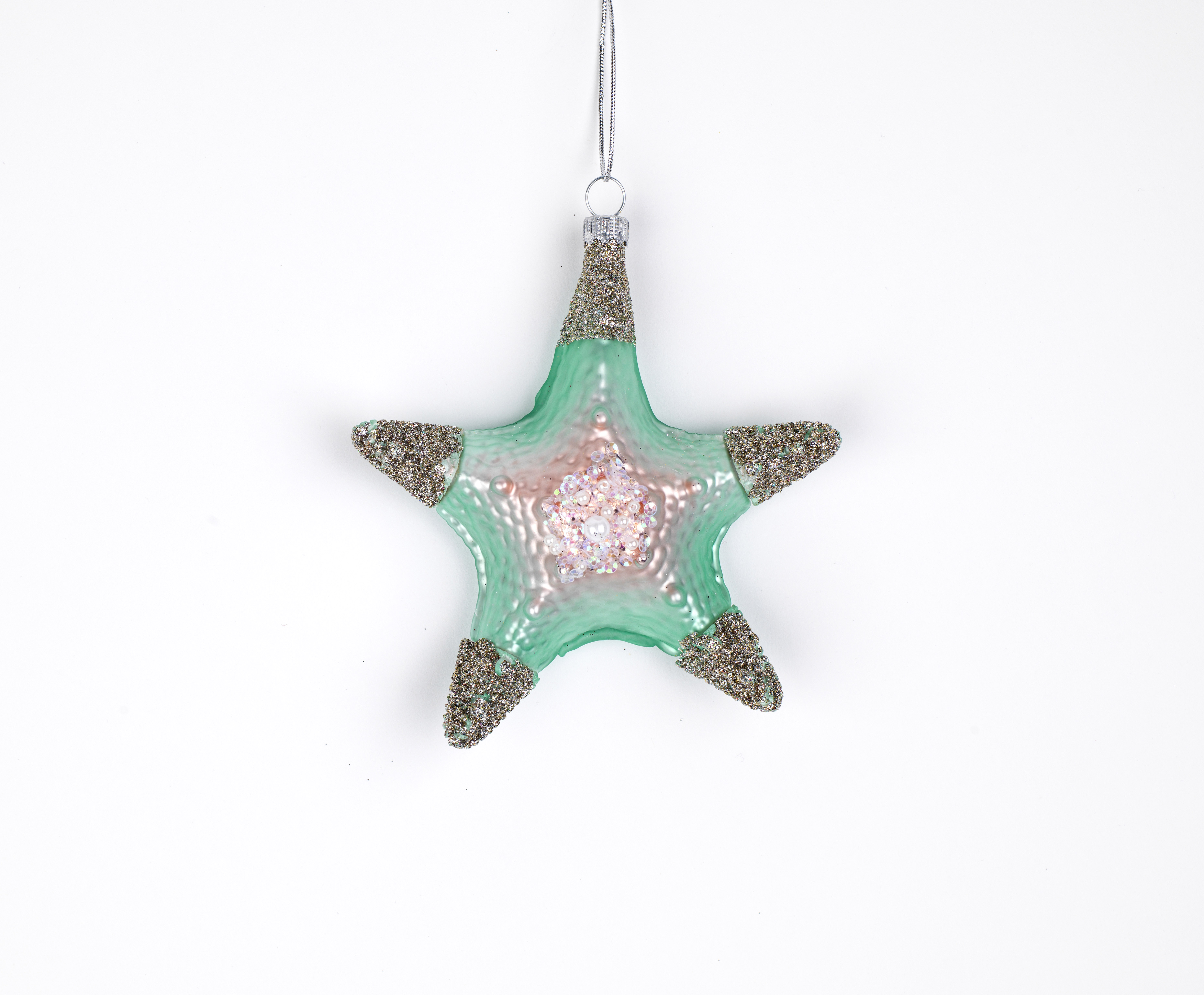 This pretty hand painted glass star fish Christmas decoration is a fun celebration of life under the sea. Encrusted with silver glitter, faux pearls and sequins for a luxurious finish which will be sure to add starry sparkle to your Christmas tree. Assorted colours of blue or green. 3 dimensional. Glass, glitter, faux pearls. This item is not suitable for children.
