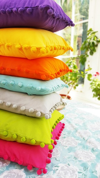 Keywords Bedroom , Blue , Bobbles , Cobalt , Colourful Cushions , Cotton , Cushion , Duckegg Blue , Garden , Grey , Lime Green , Living Room , Magenta , Orange , Pink , Pompom , Pompoms , Purple , Taupe , Teal , Yellow