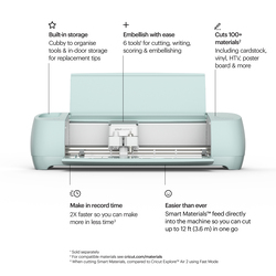Black Friday Promotion MSRP £259.99 Down from MSRP £299.99 20 November to 2 December Promotion embargo lifts 17 Nov See your creativity skyrocket with the DIY dream machine. With Cricut Explore™ 3, you can cut, draw, score and more with jawdropping speed and incredible precision. It's even compatible with Cricut Smart Materials™ for super-easy, super-long cuts up to 12 ft (3.6 m) without a cutting mat. Just load & go! Open up a world of creative possibilities with the ability to cut 100+ materials, ranging from cardstock, vinyl and iron-on to speciality materials like glitter paper, cork and bonded fabric. So whether you're making heat transfer tees to outfit an entire team or the big banners to cheer them on, you'll get your projects done in record time. Use with Design Space® app for iOS®, Android™, Windows® and Mac®.*