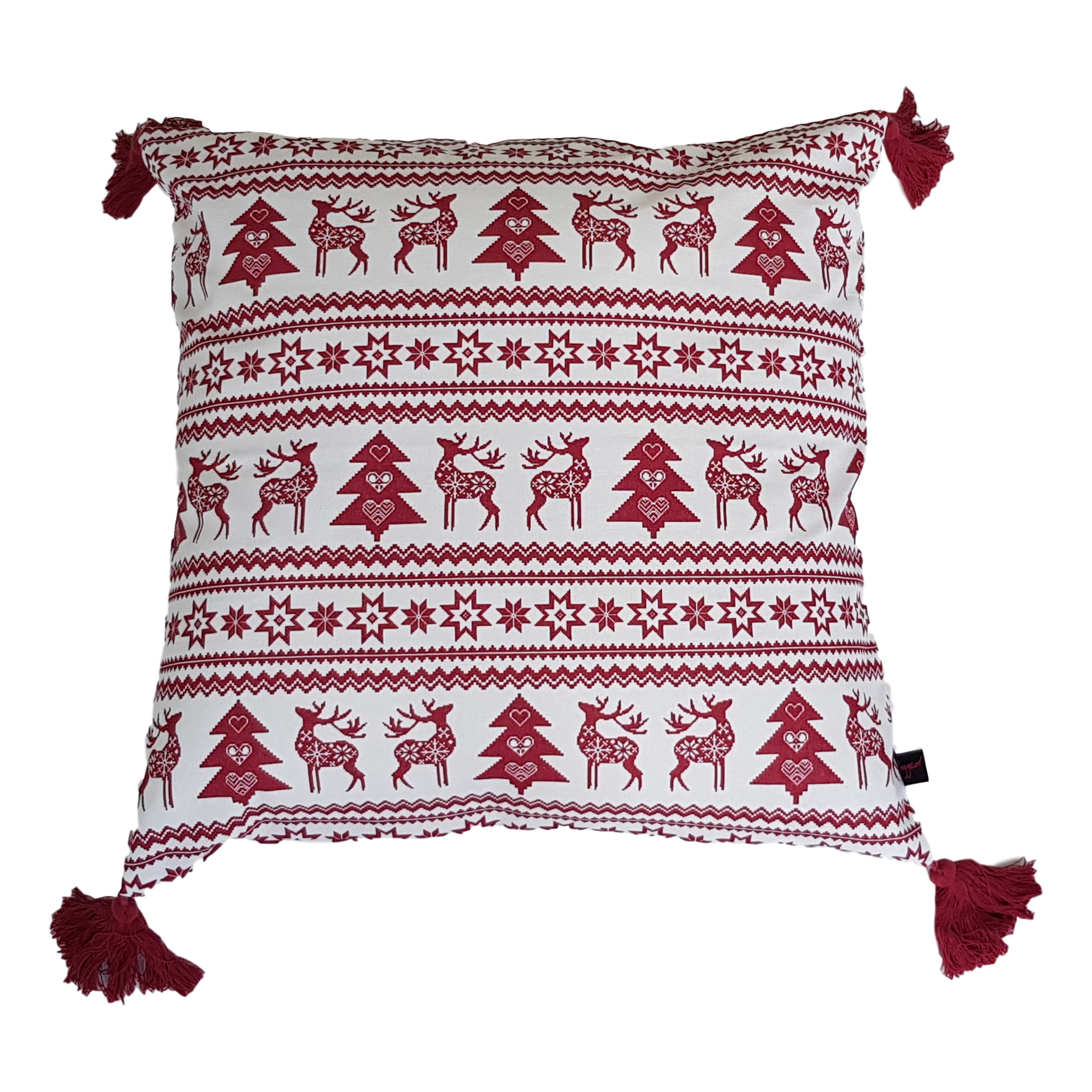 This gorgeous Nordic Fair Isle inspired pattern of reindeer and snowflakes amongst Christmas trees is a real show stopper! Trimmed with matching red tassels at each corner makes this Christmas cushion really special. Key Features Red Reindeer Christmas Cushion with snowflakes and fir trees Traditional red colourway on an ecru background 100% cotton Removable poly-fill inner pad Zipper Fastening Large size 50 x 50 cm/20 inches square Machine washable, cool wash with non-bio detergent Matching items available Red Christmas Cushion This gorgeous Christmas Scatter Cushion is larger than average and is made from 100% cotton. Seasonal red is the main colour for this Red Cushion. The all over print features red Christmas Stars, with pretty reindeer and Christmas trees across an ecru background. It is trimmed with retro red cotton tassels to match the design. This beautiful red sofa cushion will definitely add a festive touch to your hall, kitchen or living room this year.