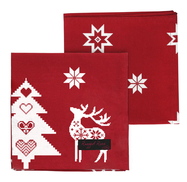 Red Christmas Cotton Napkins Decorate your Christmas Table with these beautiful seasonal Red Christmas Napkins with white snowflakes. In a seasonal red colour, these festive napkins will add some Christmas spirit to any home. These Christmas Napkins are made from 100% cotton. Our gorgeous sophisticated cotton napkins are beautifully folded into packs of four. These are then lovingly gift wrapped with a pretty seasonal bow. Making them great gift ideas and ideal stocking fillers for Christmas or you could simply treat yourself! Each pack consists of two reindeer and two snowflakes napkins so you can mix and match. The first pair features a white reindeer and white heart decorated Christmas tree. The second pair features a simple yet stunning print of white festive snowflake stars. All of the napkins in these packs have the same red background colour. These Red Napkins measure 40cm x 40cm and so will look stunning on your Christmas table this year. Try folding your cloth napkins so they resemble those featured in our picture gallery above? Features of Christmas Napkins 100% cotton Christmas Napkins Seasonal red featuring white Christmas reindeer, stars and heart decorated trees Available in packs of four Gift wrapped Size 40cm x 40cm Machine washable at 30 degrees Matching items available