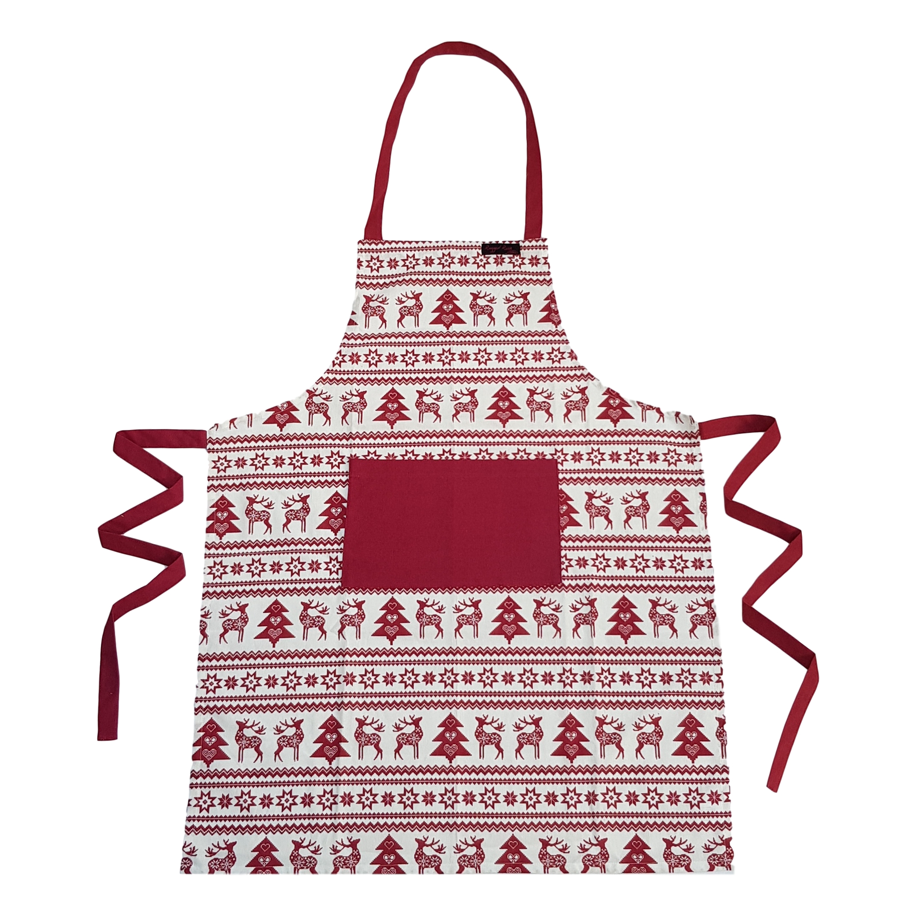 Red Reindeer Christmas Apron Get into the Christmas spirit when cooking by wearing this Fair Isle style pattern Red Christmas Apron that’s covered in red reindeer and festive snowflakes. This gorgeous Christmas Apron is made from 100% cotton. It features a soft ecru background with deep red reindeer and snowflakes runnning across the apron ties, neck strap and front pocket are in plain red. This contrasts well with the rest of the festive apron. It’s a case of one size fits all, so perfect for both men and women. This means anyone can cook the Christmas meal this year! The Red Christmas Apron measures 85cm (length) by 68cm (width). The apron ties are both 90cm long. It should fit comfortably on the body no matter what size you are! Your Christmas Apron is made from 100% cotton so it’s suitable for a machine wash.