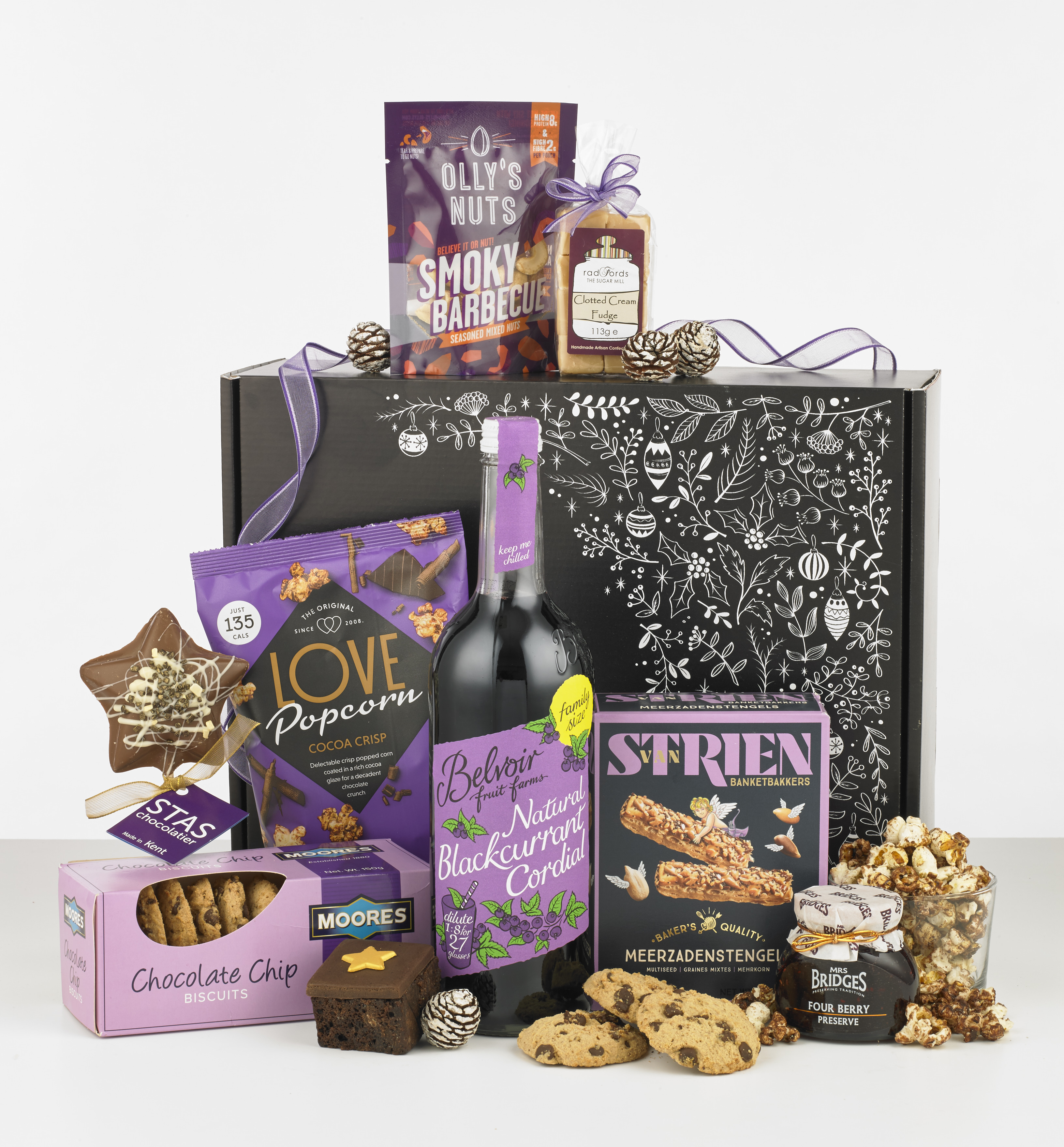 Bursting with classic festive colours this stunning gift box is sure to make an impression. Whether this hamper is for yourself, or a thoughtful non-alcoholic gift to a loved one, it will make the perfect accompaniment to your festivities. This includes: Belvoir Natural Blackcurrant Cordial Mrs Bridges four berry preserve Moores Chocolate Chip Biscuits Clotted Cream Fudge And more!