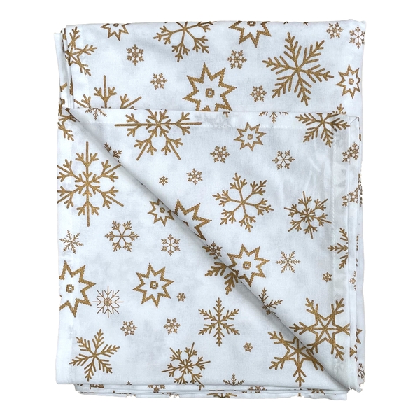 Tessa gold snowflake cotton christmas table cloth size: 140 cm x 230 cm Stylish festive tablecloth with an array of metallic gold snowflakes and stars. Matching napkins also available.