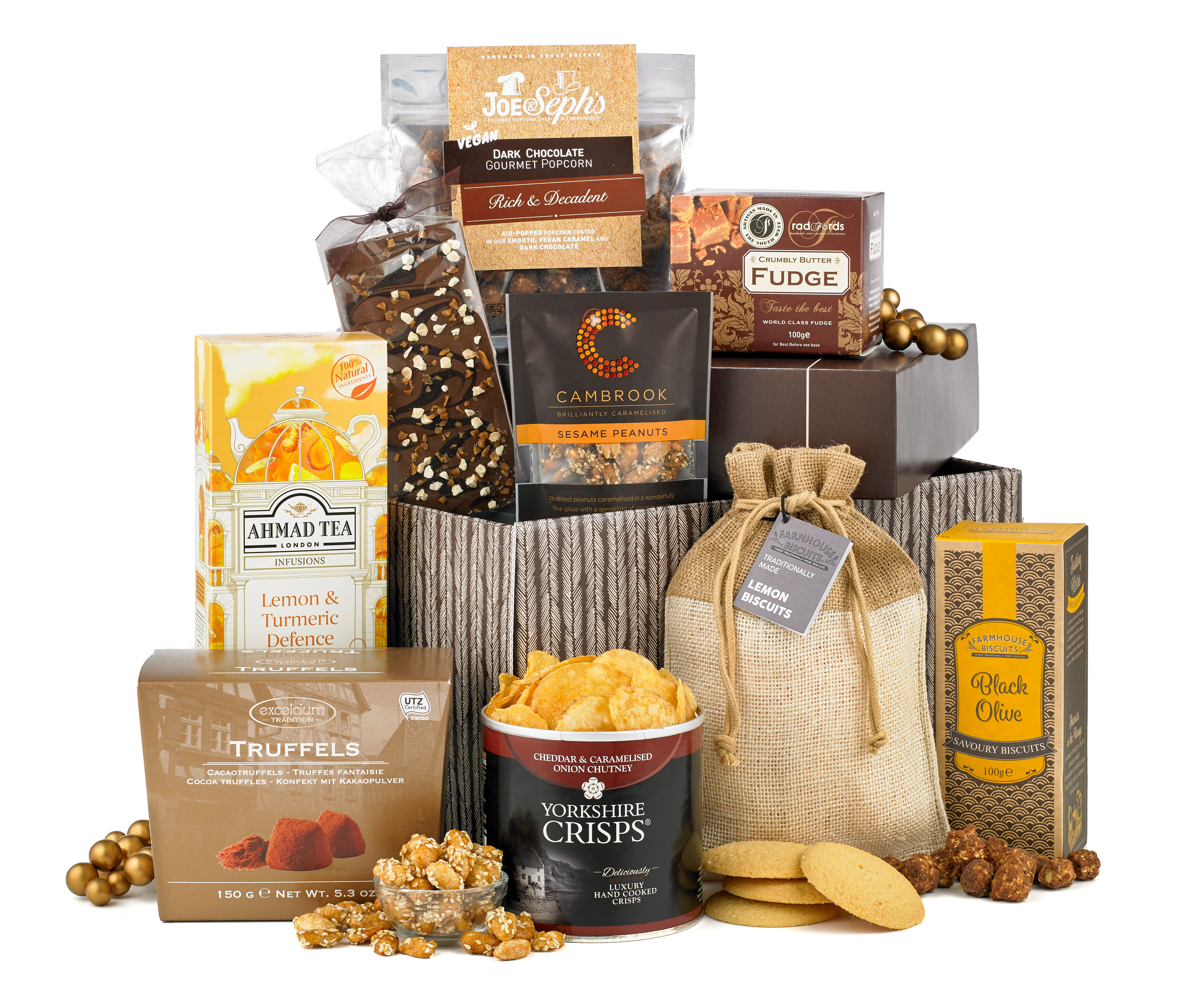 Nothing will bring you closer to Heaven on Earth than the tasty contents of this basket. The Winter Glow includes Excelcium Cocoa Dusted Truffles, tempting Cambrook Caramelised Sesame Peanuts and a bag of luxurious Farmhouse Lemon Biscuits.