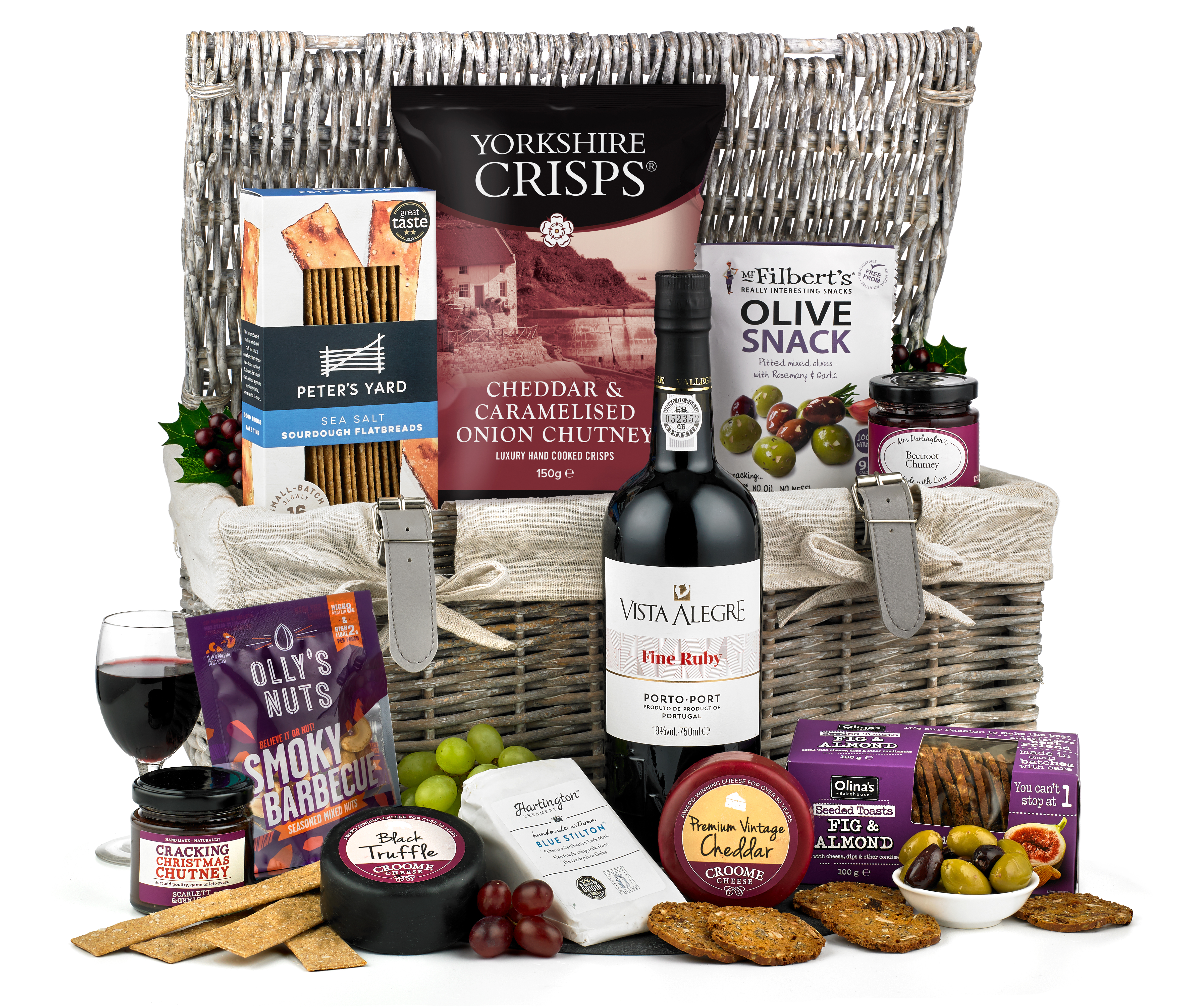 The Boxing Day hamper is a beautiful collection of savoury delights hand-packed into a lined, grey wicker hamper basket that can be reused for years to come. This port and cheese hamper includes three artisan English cheeses along with a range of chutneys, crisps and other savoury treats, the perfect alternative to leftover turkey.