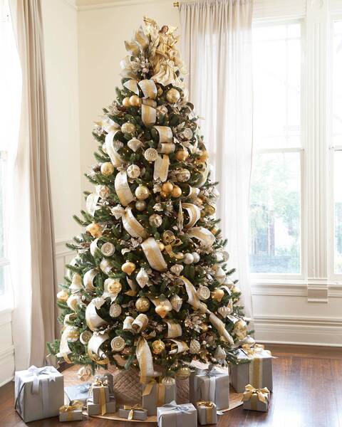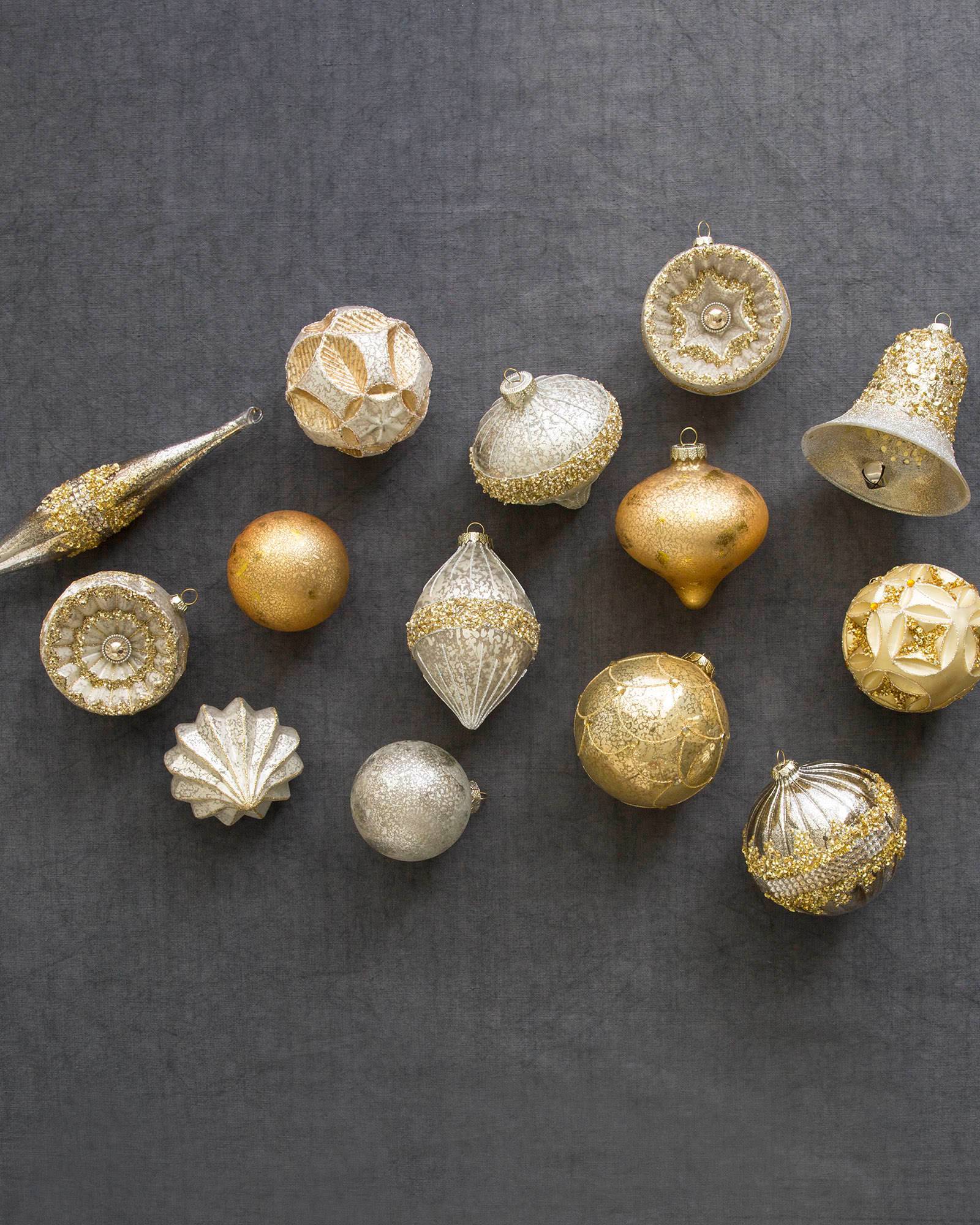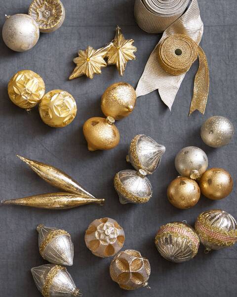 Taking inspiration from finely crafted jewellery and gilded trimmings, our Silver and Gold Glass Bauble Set features highly decorated blown-glass Christmas decorations. Designed exclusively for Balsam Hill, these heirloom-quality pieces are embellished with intricate beading and lightly dusted with glitter. The varied shapes and sizes add depth to your décor, while the elegant tones of gold, silver, and platinum lend a lustrous touch to your tree. - An assortment of teardrops, balls, and finials in metallic hues - Made from hand-blown glass - For light coverage when combined with your existing baubles, consider one 35-piece set for a 4.5'-6.5' tree, two for a 7.5' tree, and three for a 9'-10' tree; increase by one set for fuller coverage - For light coverage using only baubles from this kit, consider two 35-piece sets for a 6.5' tree, three for a 7.5' tree, and five for a 9'-10' tree; increase by one set for fuller coverage