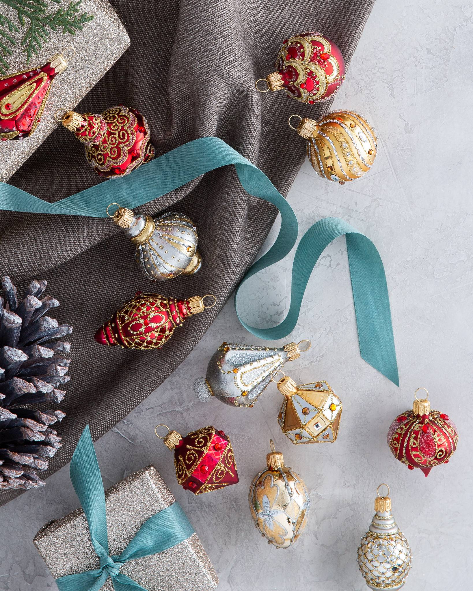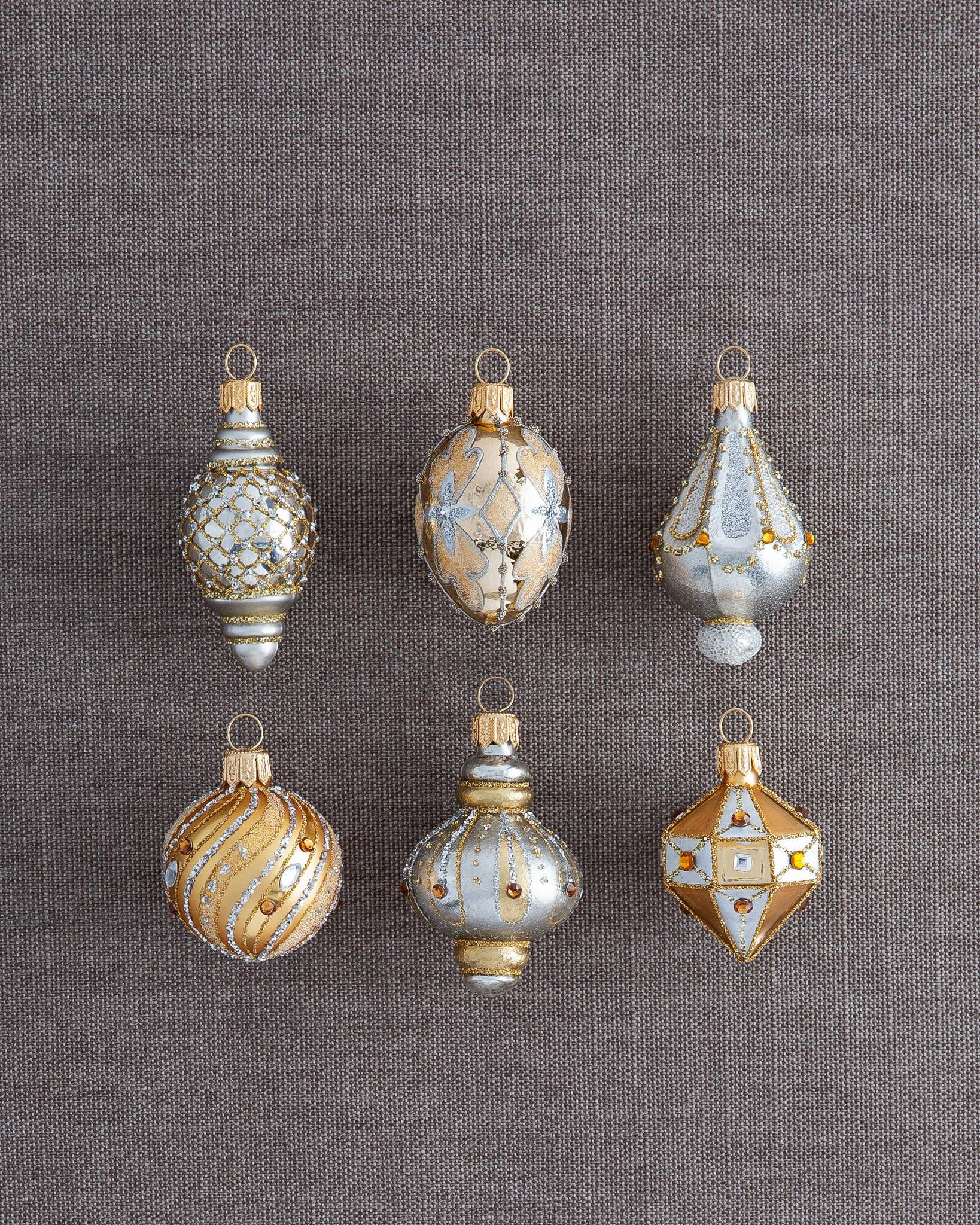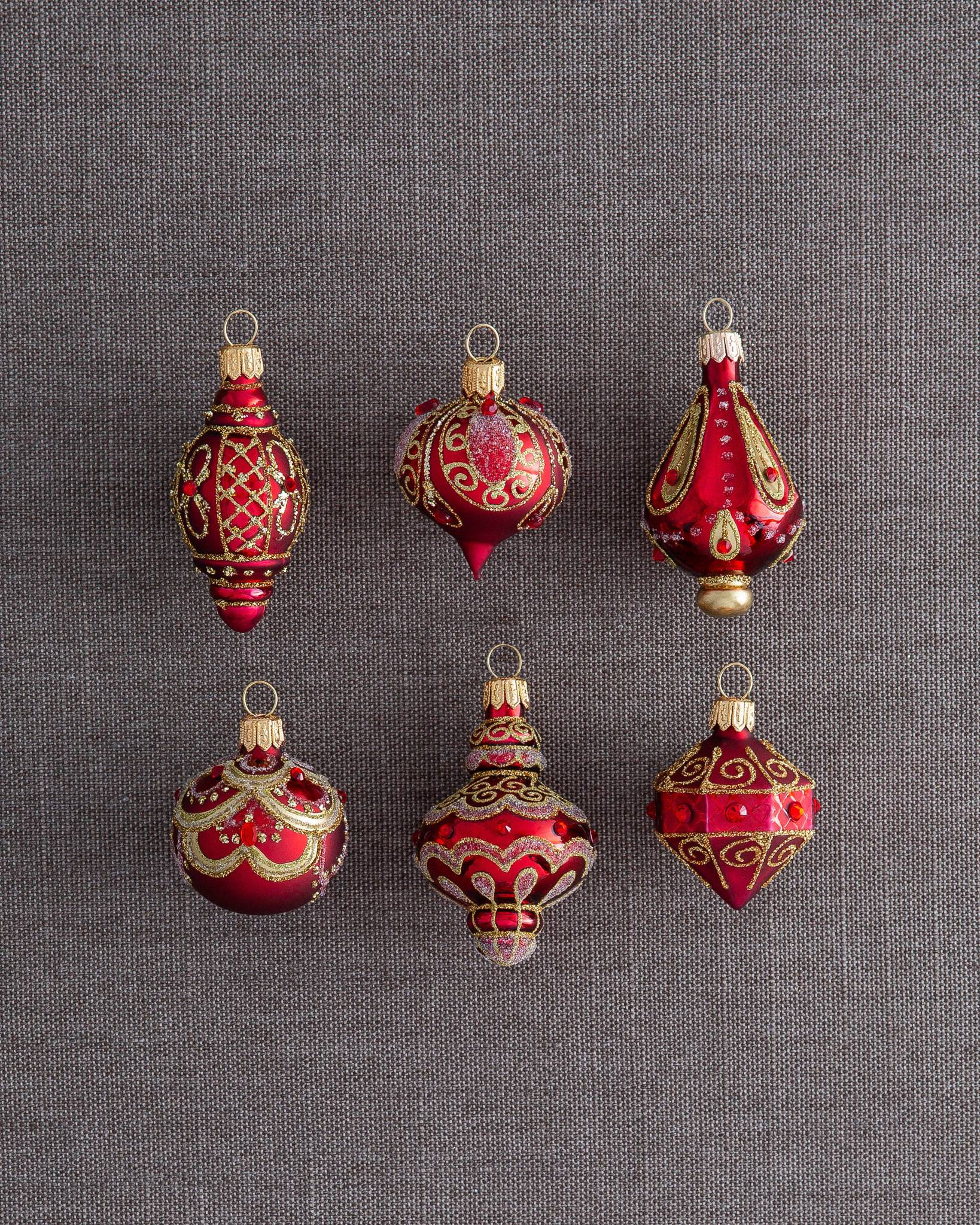 Perfectly scaled for cosy interiors and tabletop trees, our mini baubles add sparkle to your Christmas décor. Red, gold, and silver glass baubles are crafted and painted by hand, then embellished with glitter and faux jewels for a touch of elegance. Decorate with one set for a unified look, or mix and match these miniature treasures for a unique Christmas display. - 6-piece Red and Gold set features miniature balls and finials in red and gold with glitter and faux jewel accents - 6-piece Silver and Gold set features miniature balls and finials in silver and gold with glitter and faux jewel accents - Handcrafted from glass and painted by hand - Made in Poland